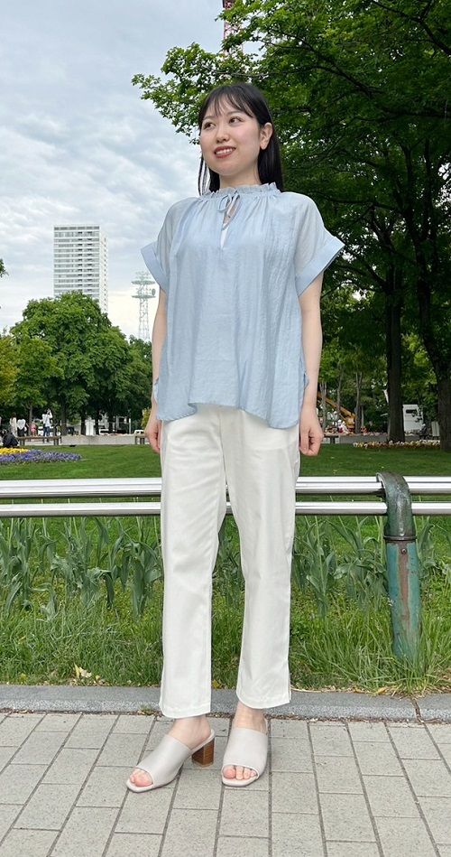 本日は、人気のストレッチパンツと涼しげなブラウスをご紹介いたします。