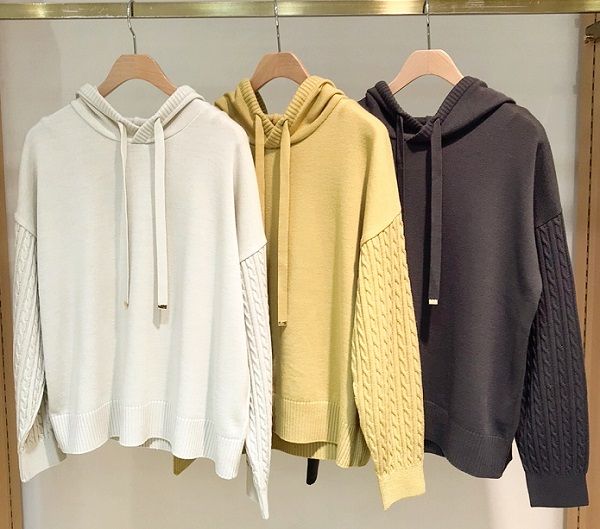 ニット素材のフーディは袖のケーブル模様がポイント☆
