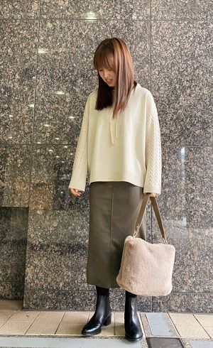 トレンドのフーディもニット素材で上品な雰囲気に。