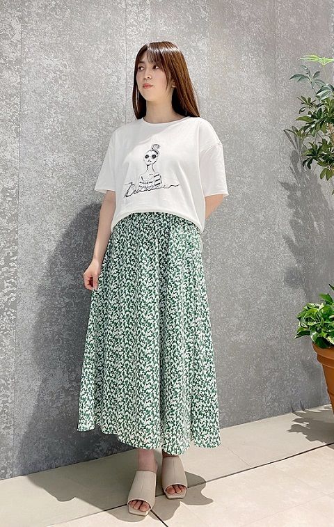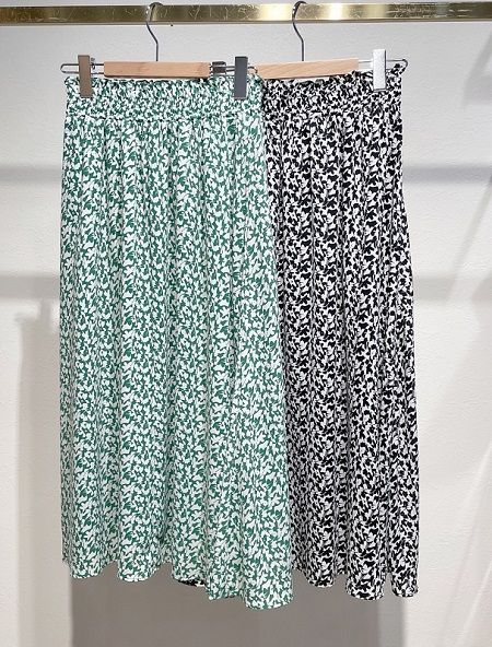 シンプルなデザインの単色フラワープリントスカート。