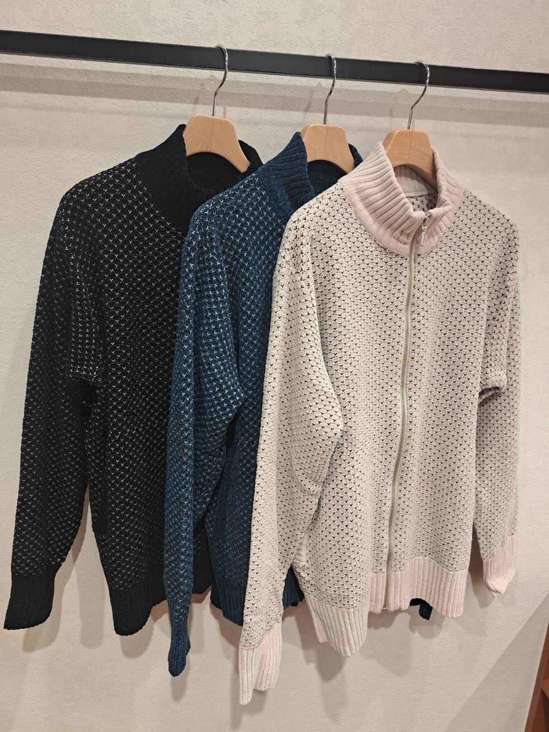 モールニットとは、モール糸と呼ばれる毛羽のある糸で編んだニットで、ベロアの様な表情やニットにありがちなゴワゴワした雰囲気もなく柔らかな肌触りが特長となっております。