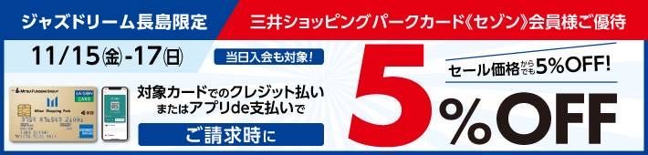 さらに15日から17日からの3日間は三井アウトレットパークカード(セゾン)のご利用で請求時5%OFFとなります。