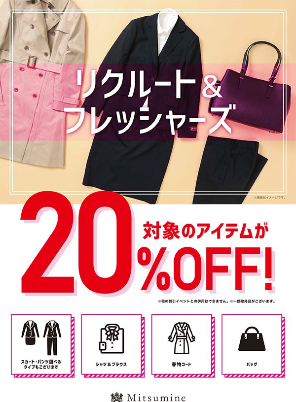 スーツやブラウス、コート、バッグなどが20%OFFとなります。
