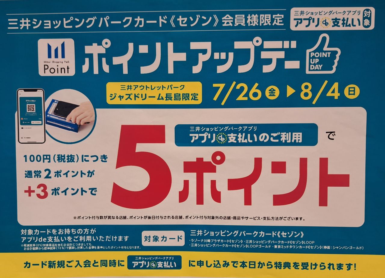 尚、8/4迄の期間中 [ジャズドリーム長島限定] 三井ショッピングカードセゾン アプリで支払いのご利用でポイントアップも開催しております!