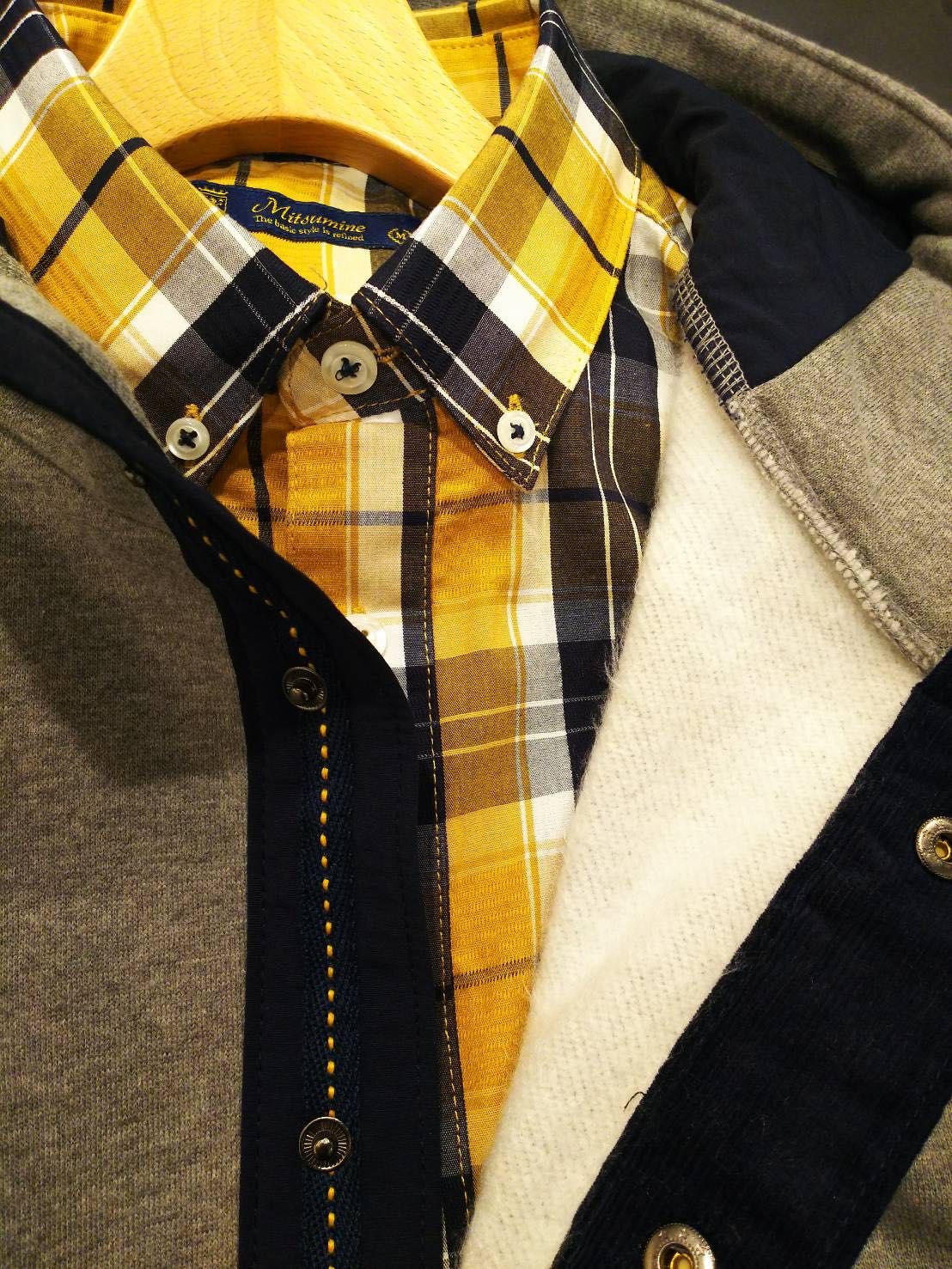 インナーにはチェックのシャツなどを合わせ、アウトドアスタイルで着て頂くのがおすすめです。