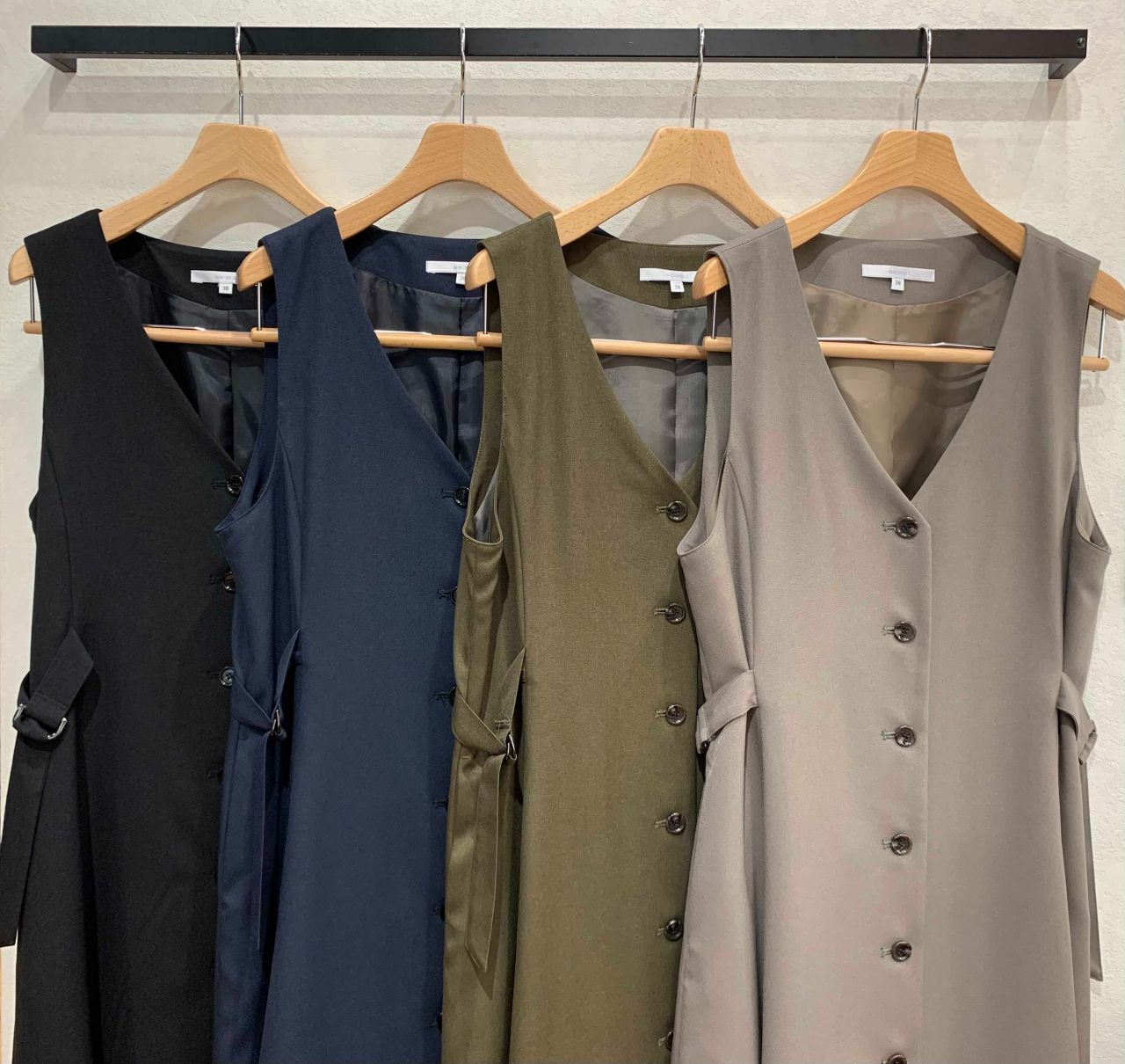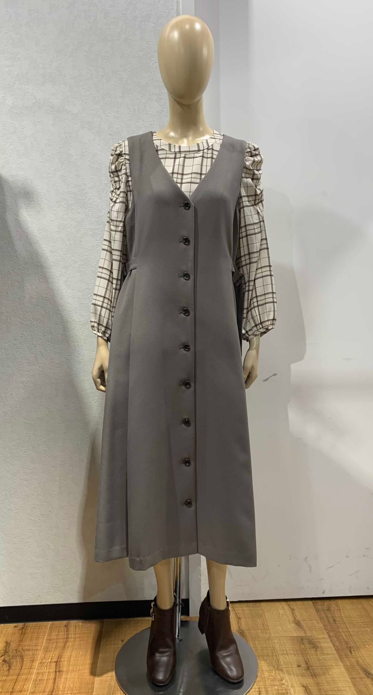 前のボタンをとめるとワンピースに、ボタンをとめず羽織でボトムスと合わせるとベストっぽくなり、