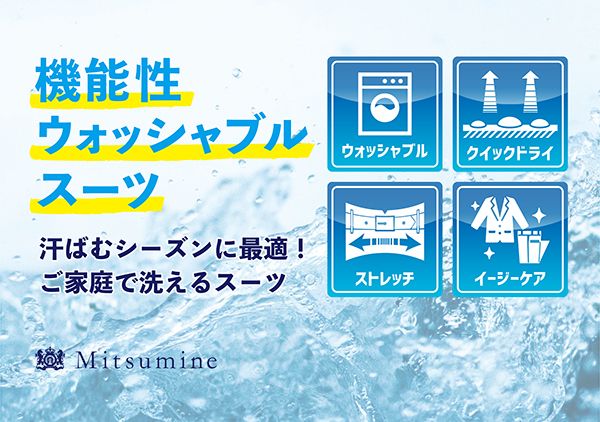Mitsumineアウトレット初登場のウォッシャブルスーツは機能性に優れご家庭で洗えるスーツとなっております。