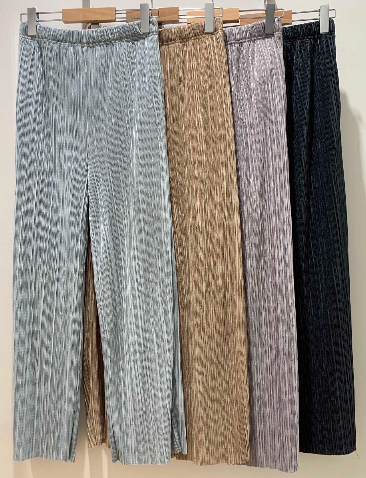 細かいランダムなプリーツ加工が施されたパンツはシルエットをすっきり見せてくれます。