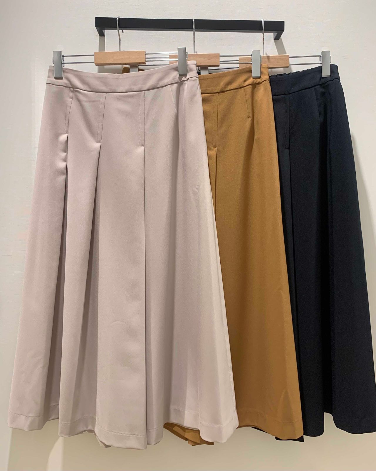 ラップ風のタックを入れ、裾までソフトプリーツを残したディティールでスカート見えになっています。
