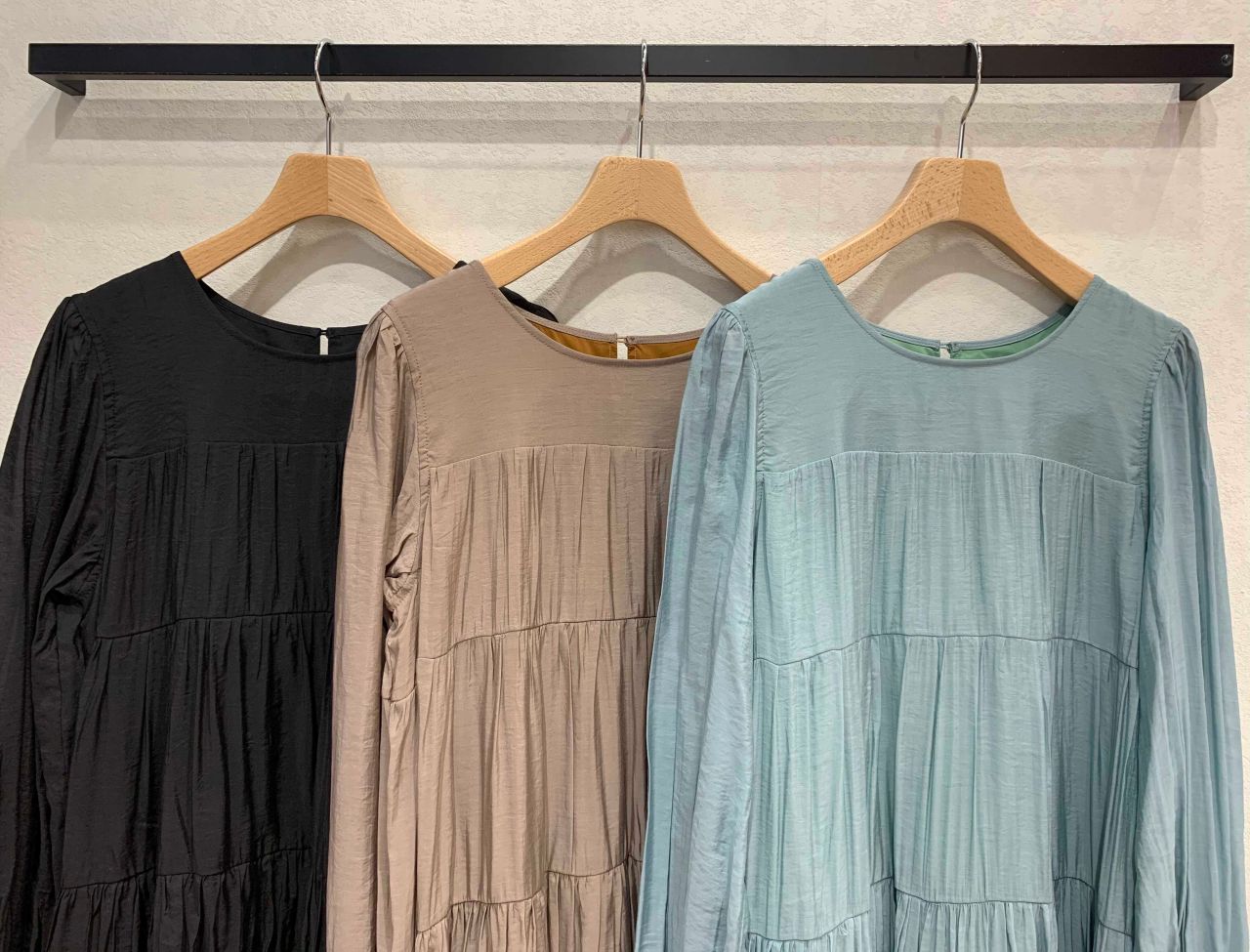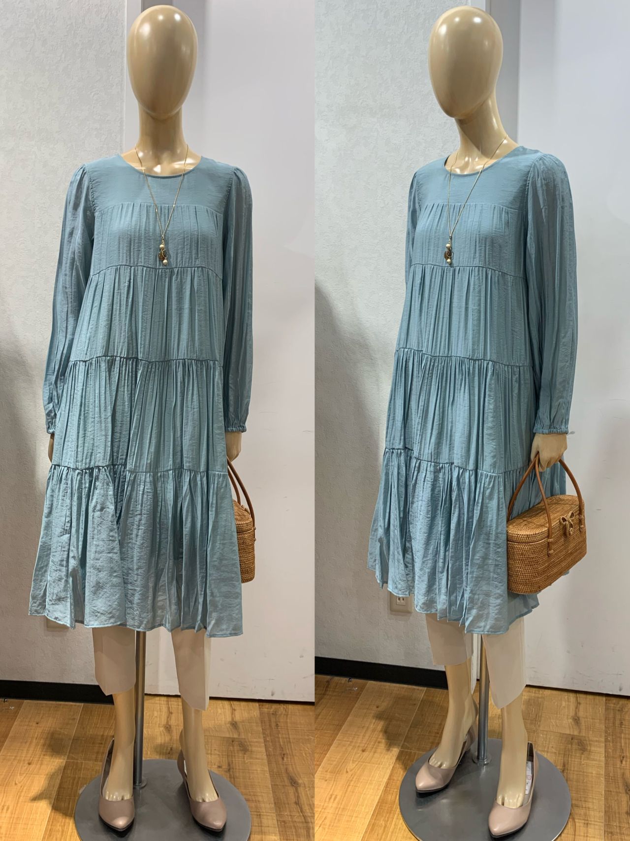 段々で切り替えし、ボリューム感のあるティアードデザインが女性らしさを引き立たせるワンピースです。