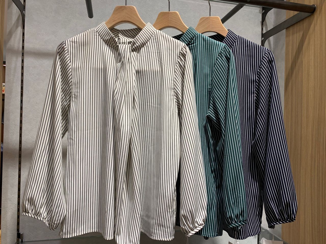 商品はこちらストライプ柄のスタンドタックブラウスです。