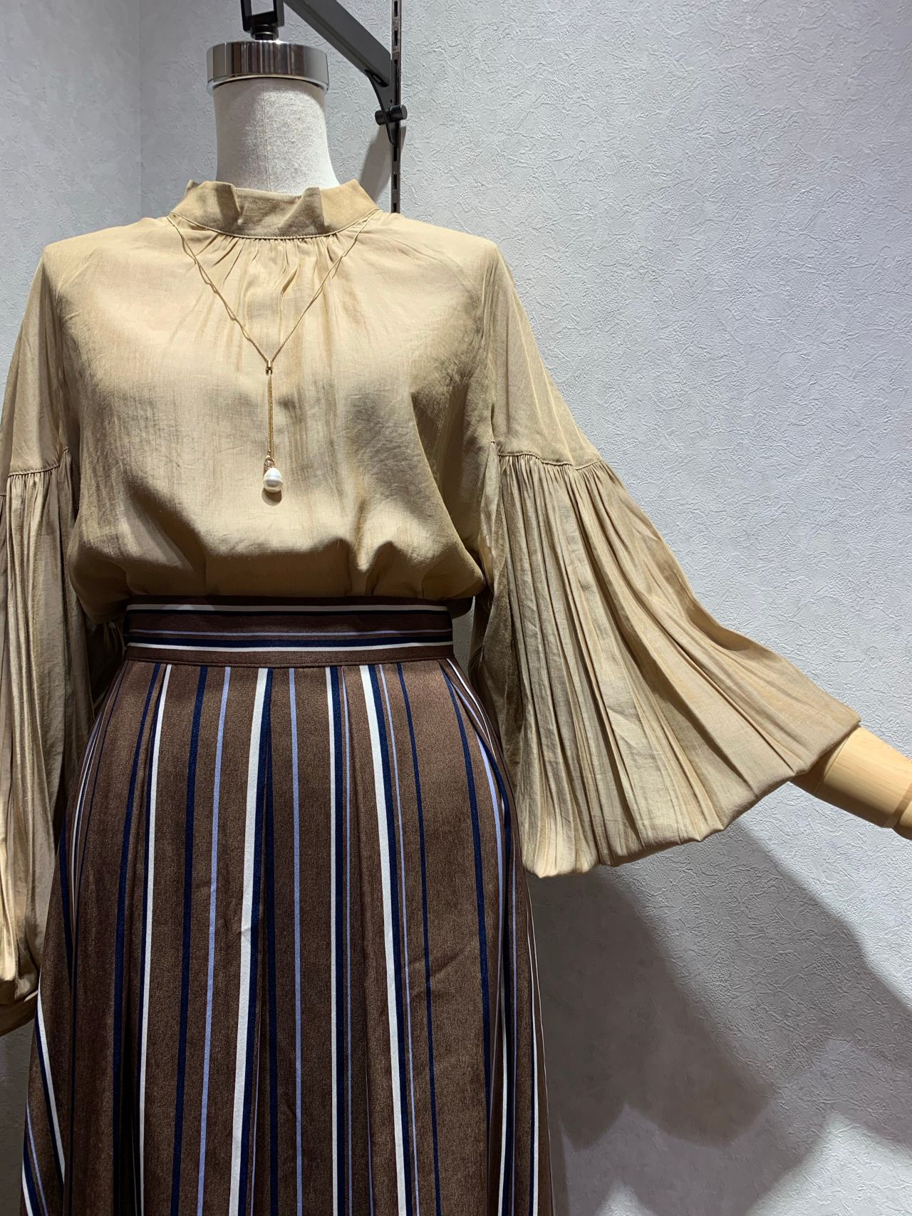 袖口にゴムが入っているので、長さの調整が出来て、昼間などまだちょっと暑い日も十分着れるブラウスです。