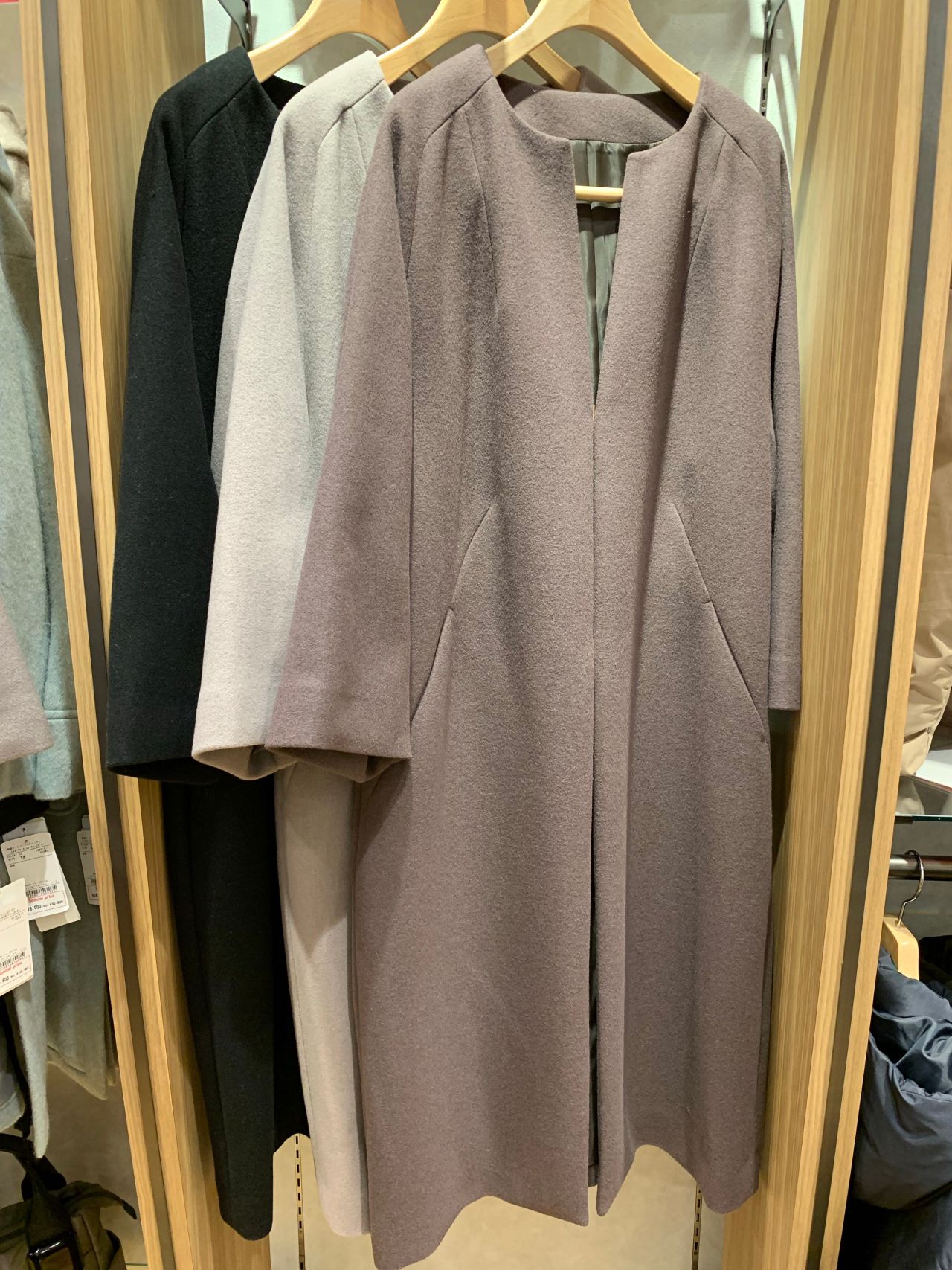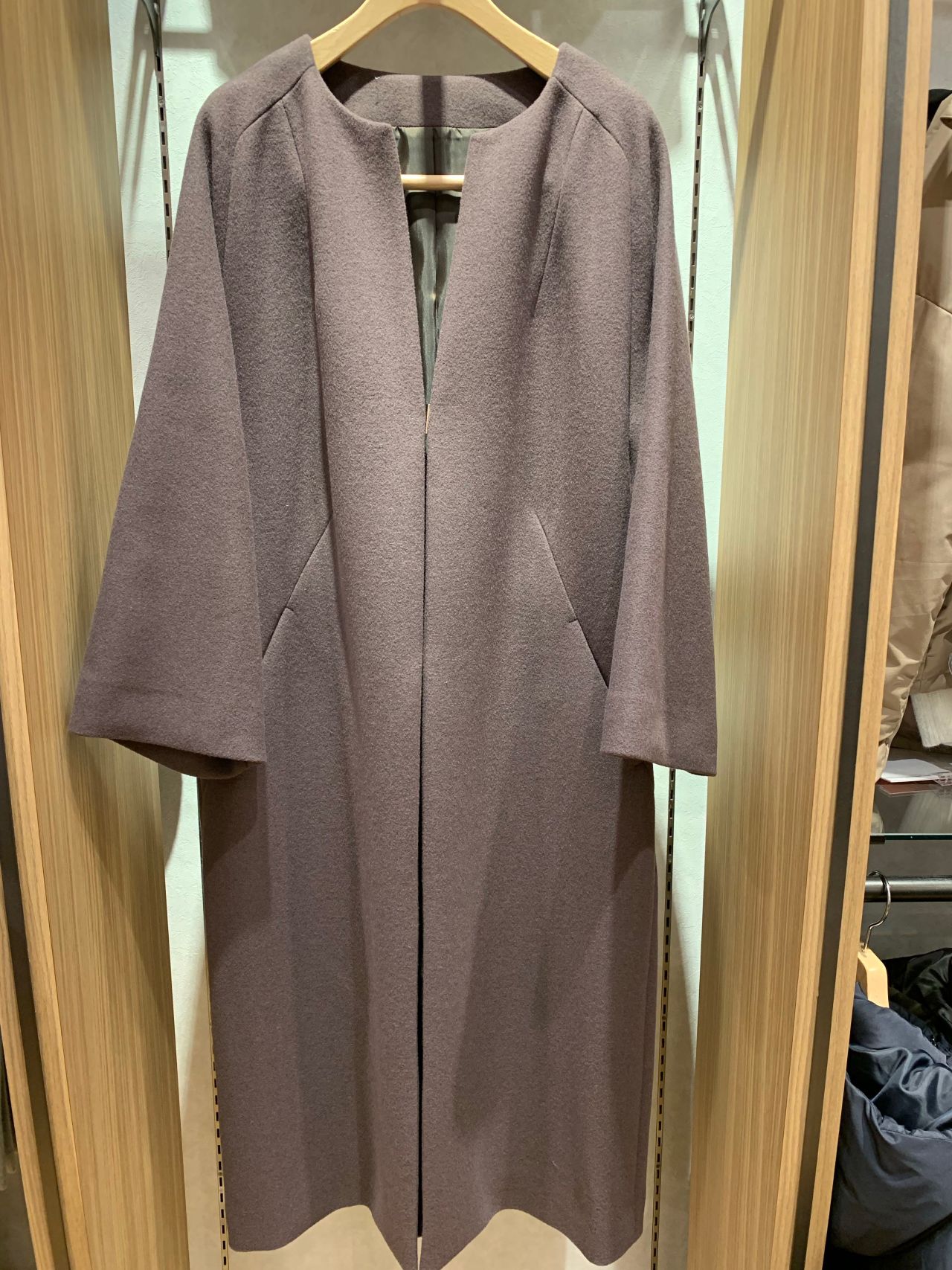 まずはノーカラーのシンプルなコートの紹介です。