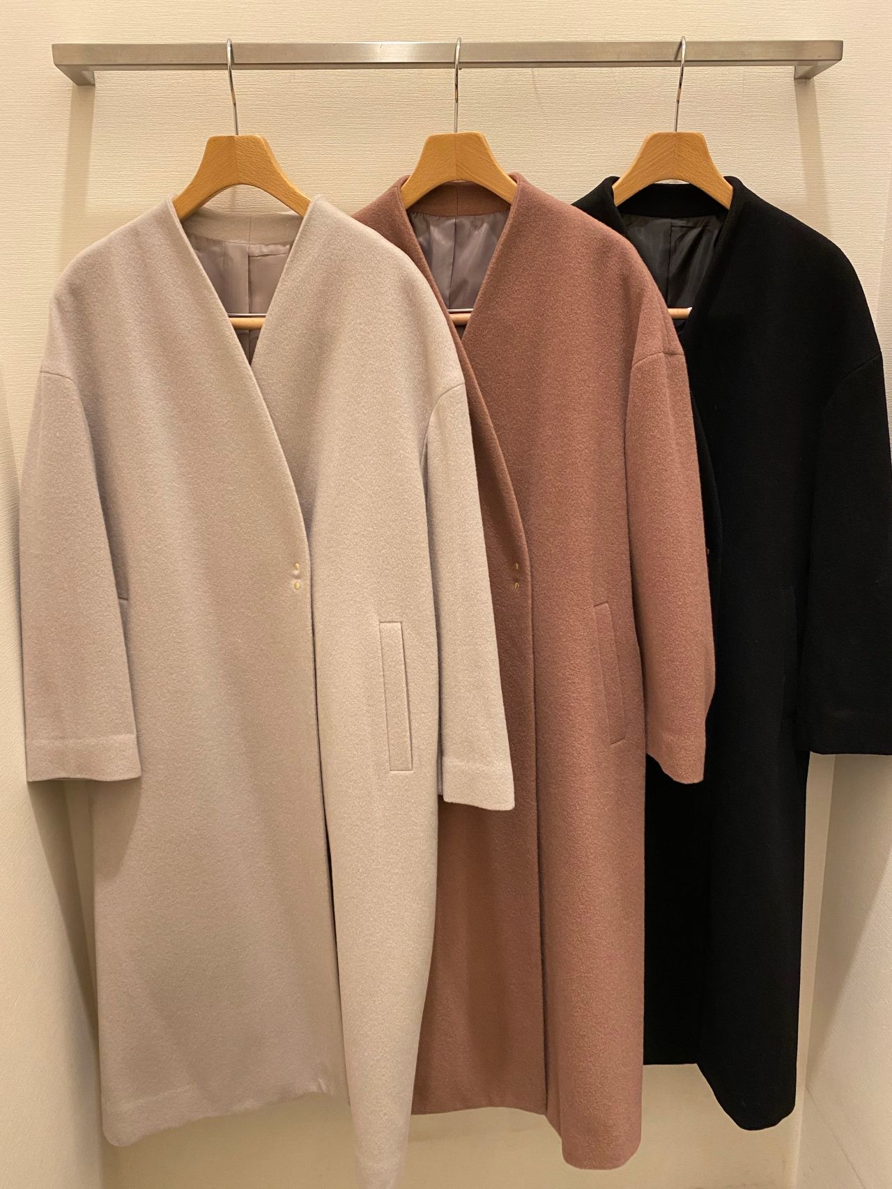 ドロップショルダーで全体的にゆったりしたシルエットに、襟元はVネックですっきりと洗練されたデザインのロングコートです。