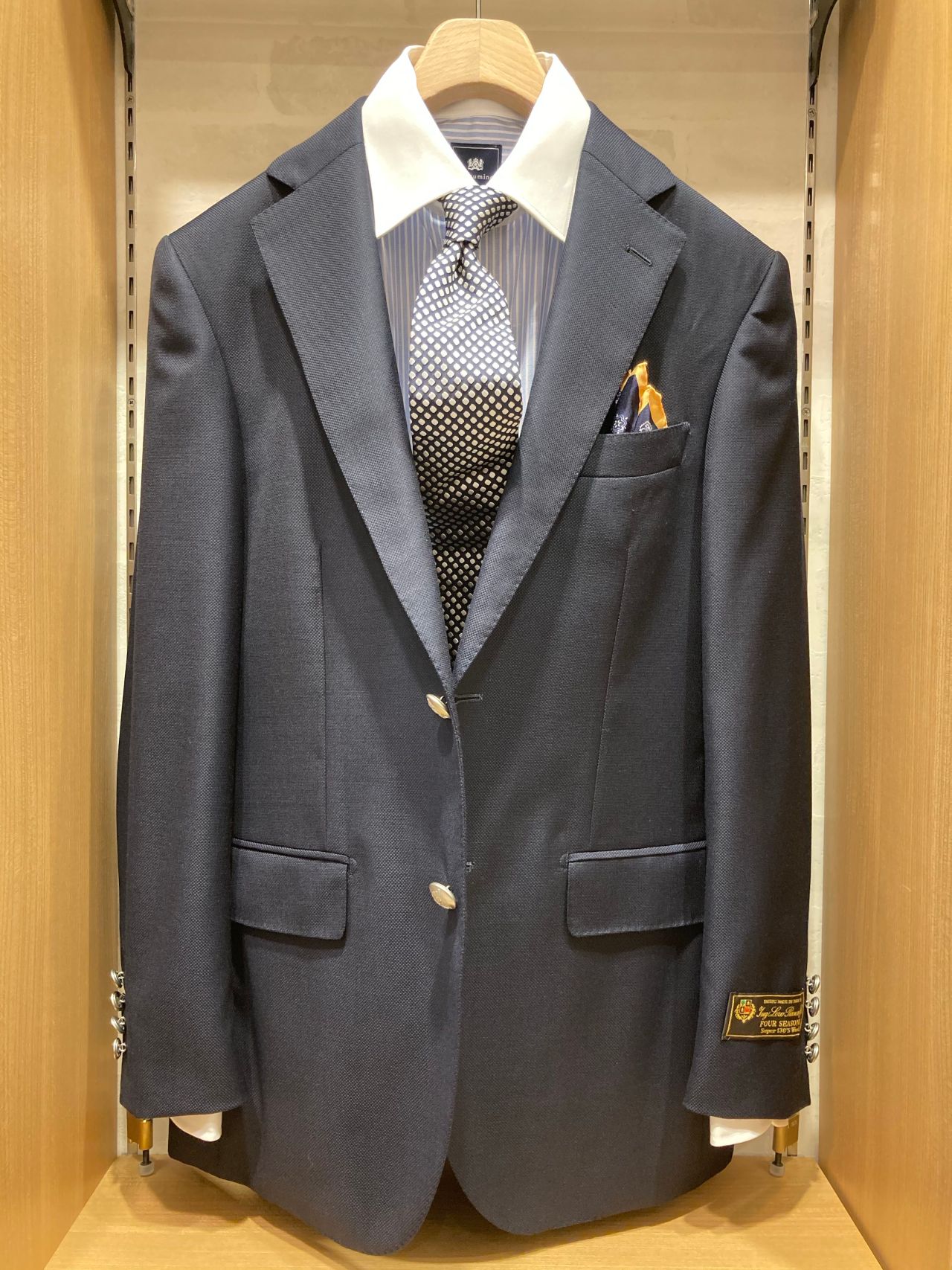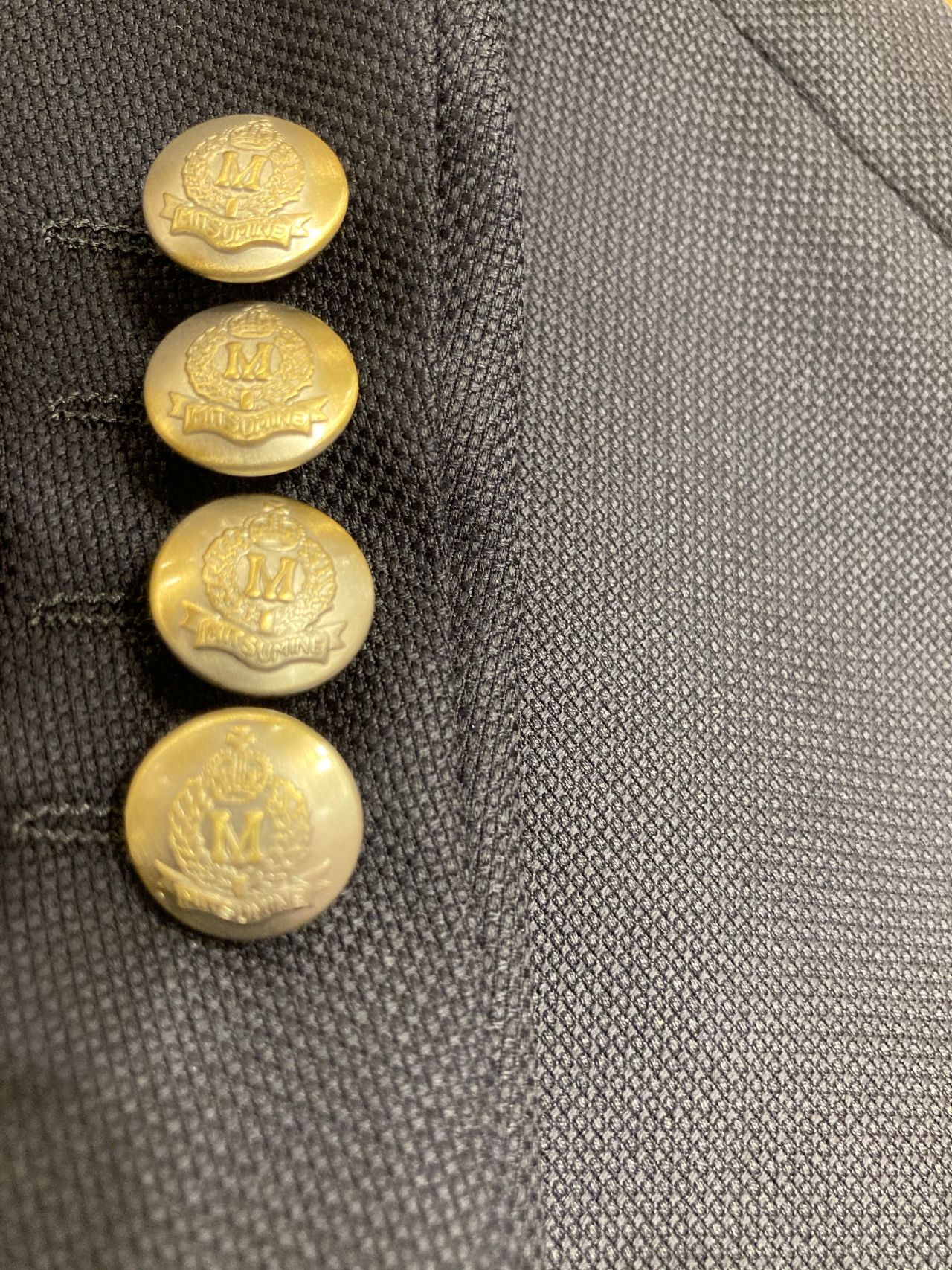 銀色のメタルボタンに当社の名前が入っている事が最大の特徴であり、存在感のある1着でございます。