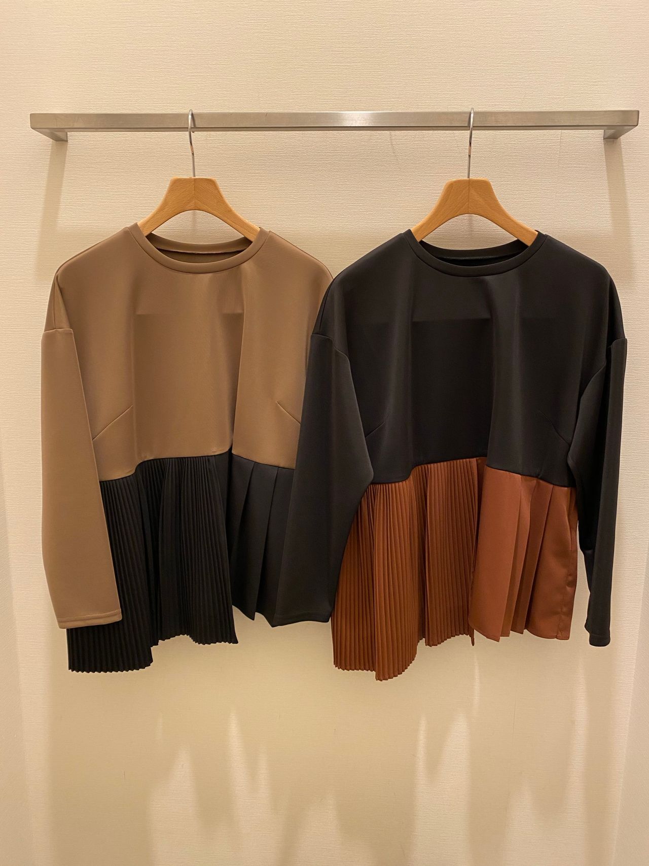 切替部分のバイカラーの生地には左右で幅の異なるプリーツデザインで変化をつけています。