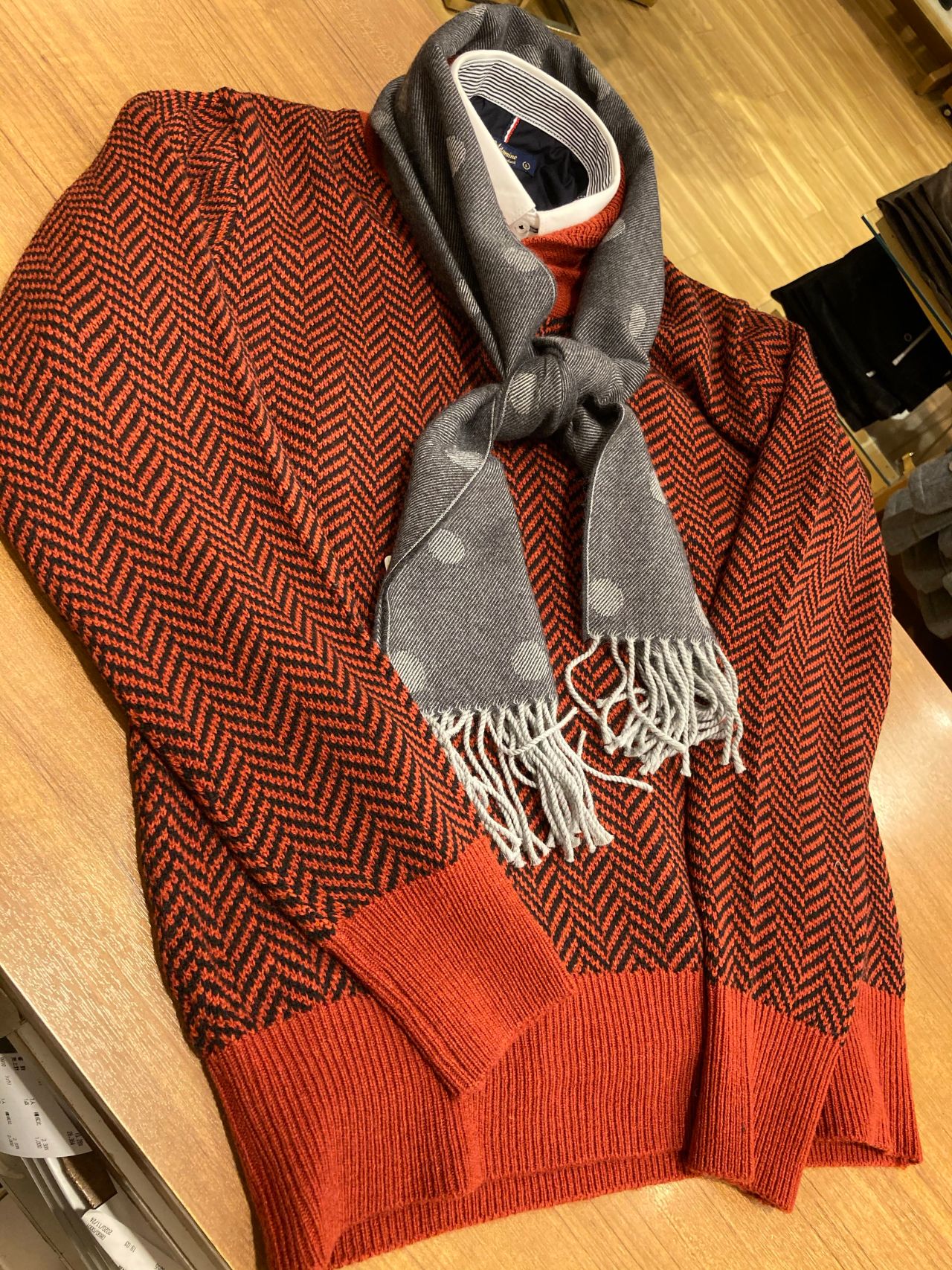 柄がヘリンボーンというデザインが細かなものになりますので、色合いにもよりけりですが、チェックシャツと組み合わせても綺麗だと思います。