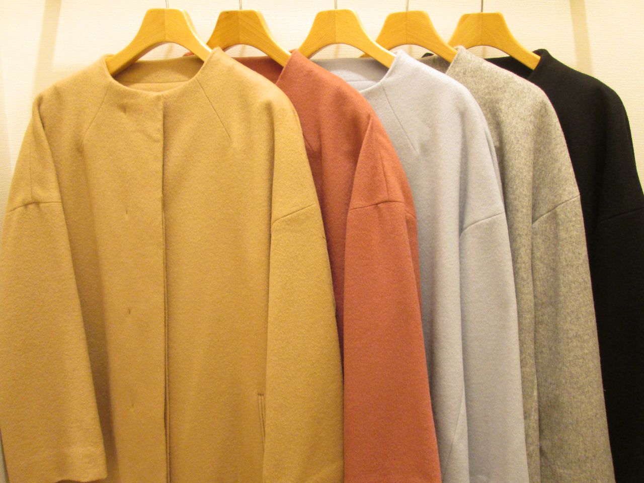 本日は、WOOL100%のノーカラーロングコートを