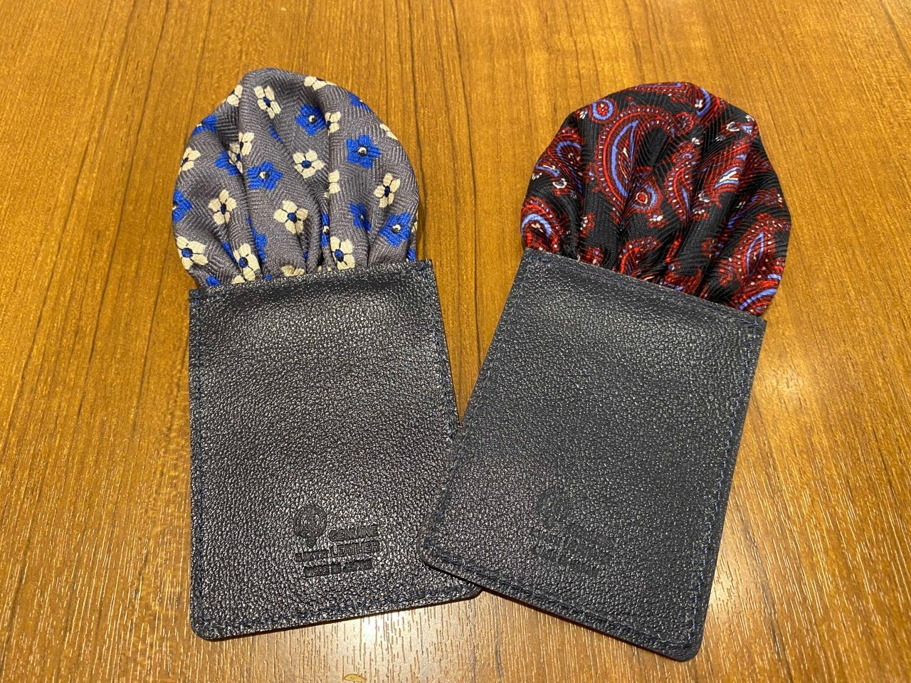 写真のように、ジャケットの胸ポケットに入れるとポケットチーフに見えるカードケースです。
