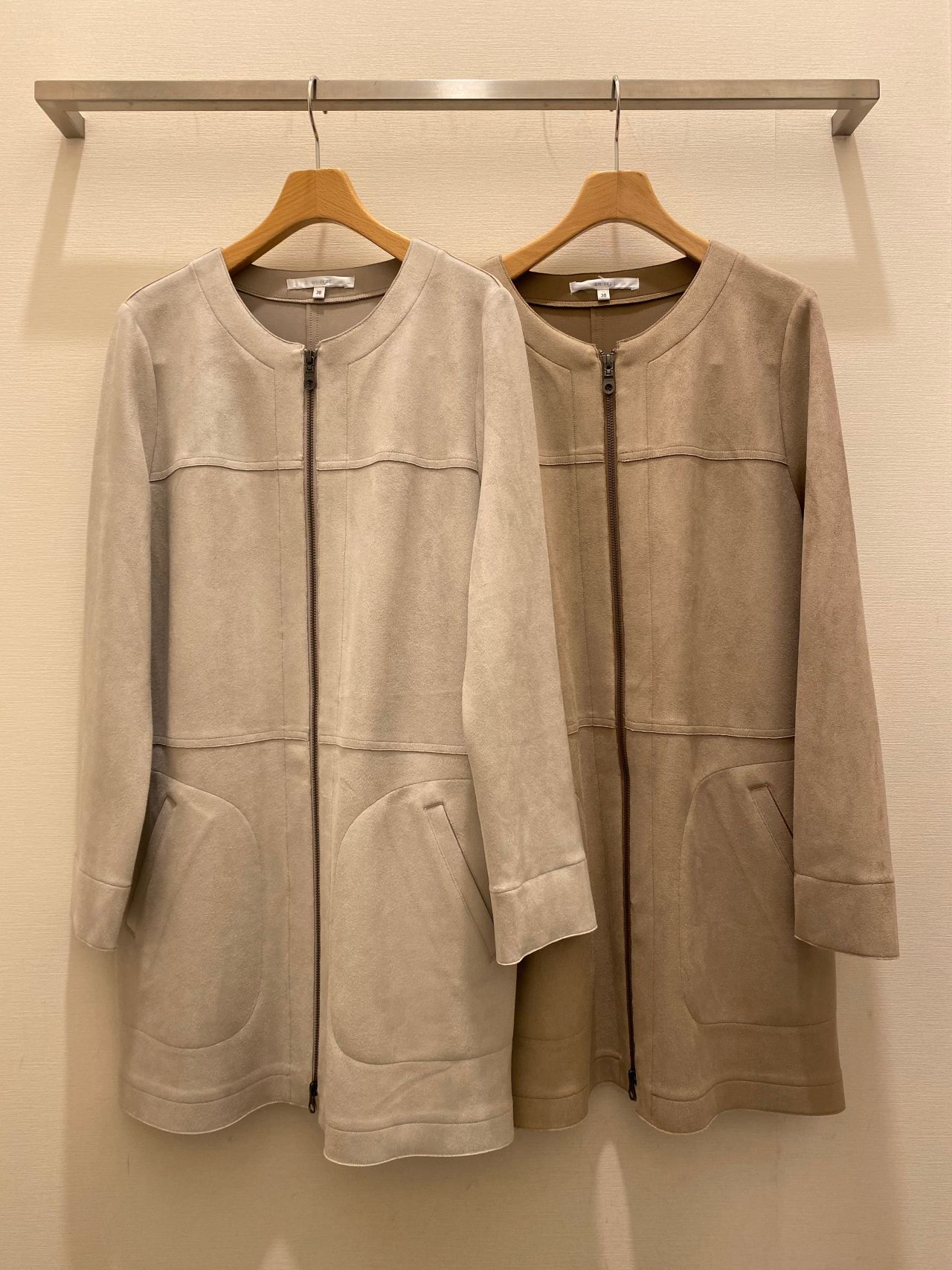 毎年人気のスエード調コート、ヒップの隠れる丈と、ノーカラーのシンプルなデザインにより、インナーを選ばずにさらりと羽織れる1枚となっております。