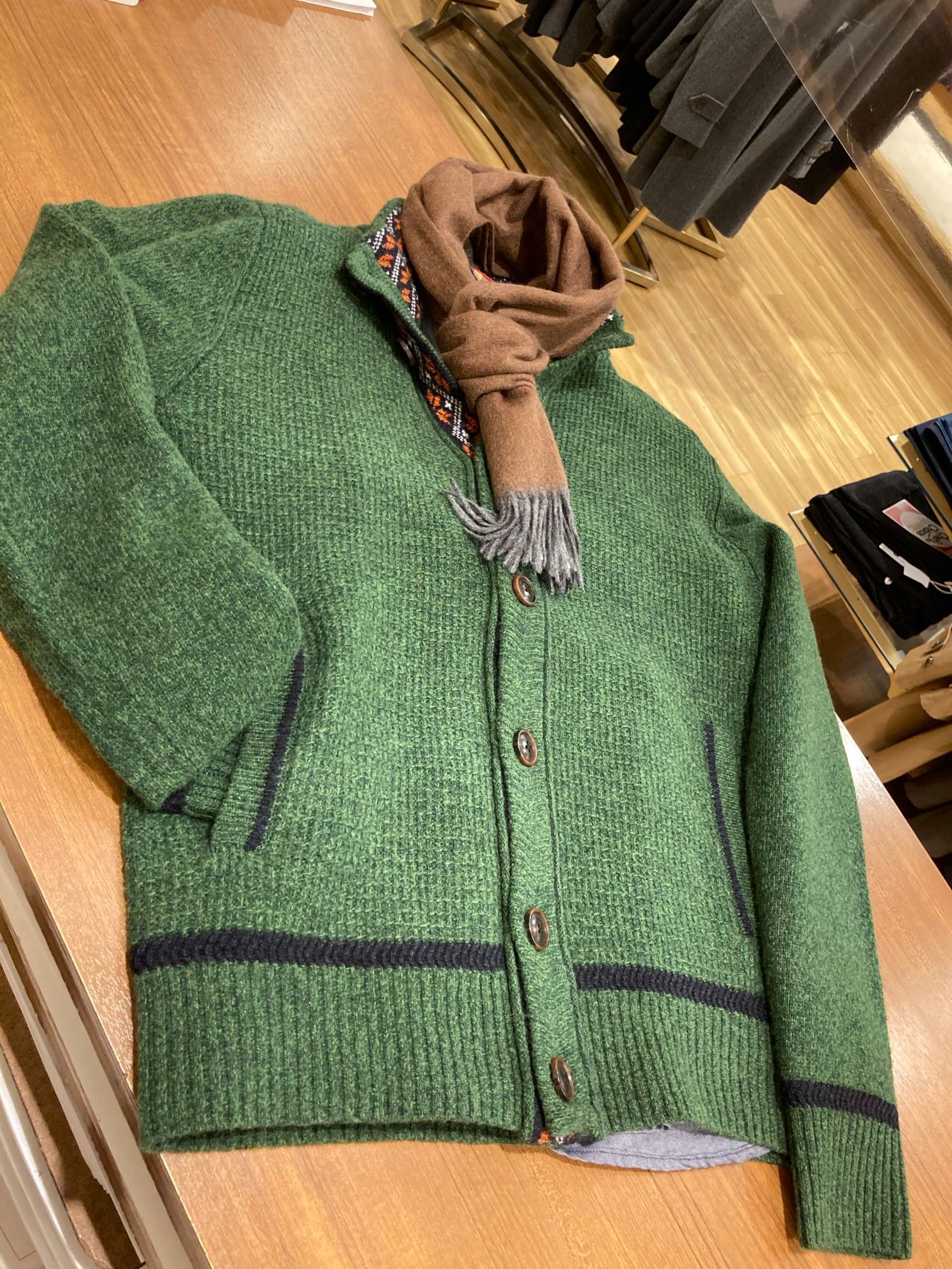 ボタン裏のノルディック柄がとても綺麗で、開けて着ても素敵な1枚でございます。