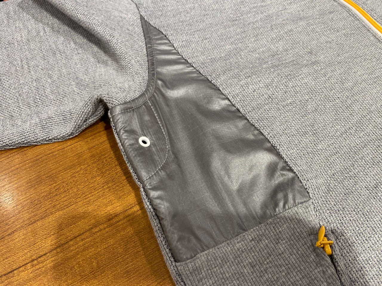 今年のカノコパイピングパーカーはモデルチェンジしており、脇下部分にテントなどで使うリップストップ生地「rip(裂ける)stop(止める)」を使用し強度UPや毛羽立ち、毛玉防止などの効果がございます。