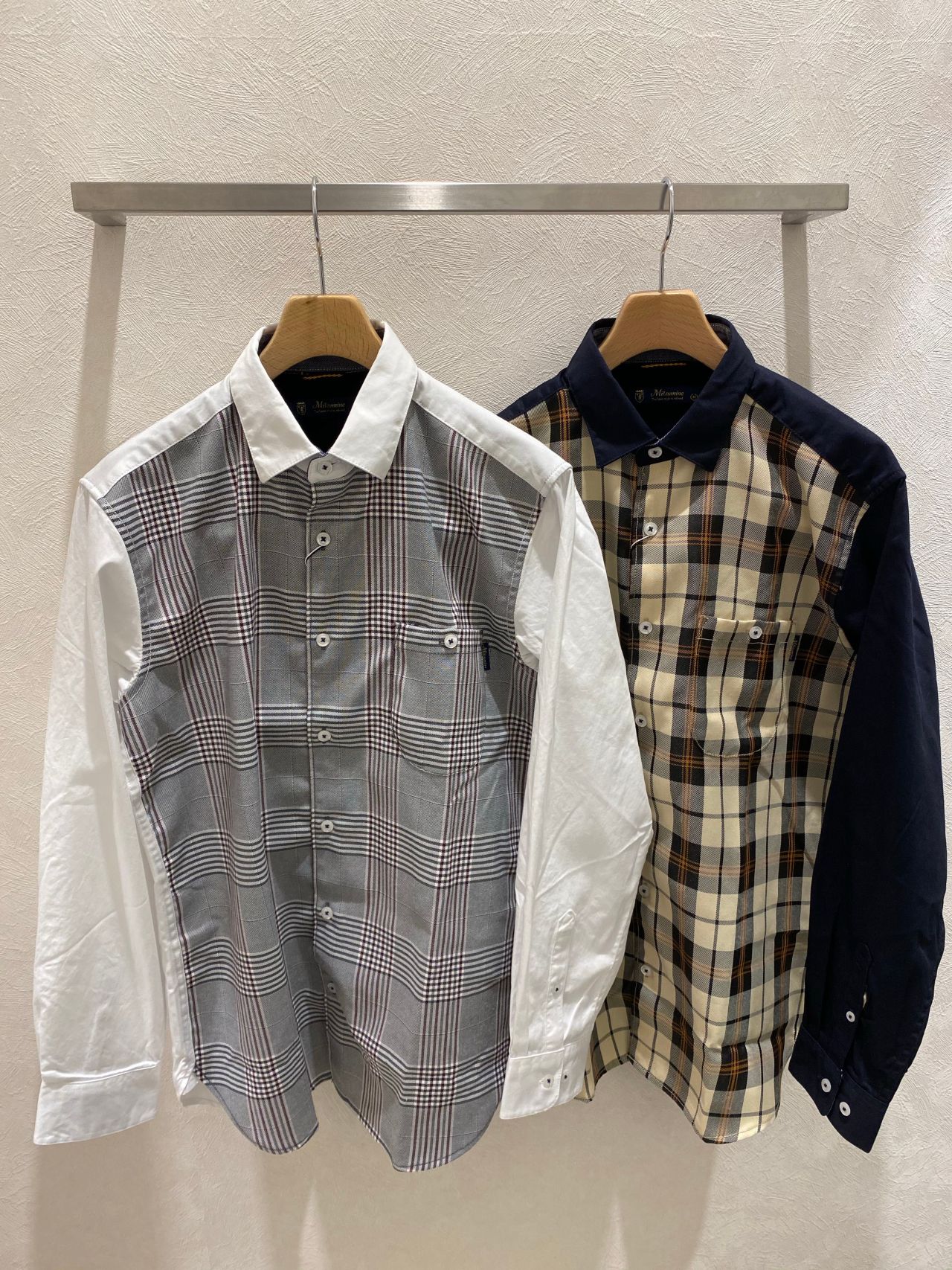 どちらのシャツもボディはコットン100%ですが、一部前身頃にはポリエステルが使われているため、シワになりにくい商品になります!