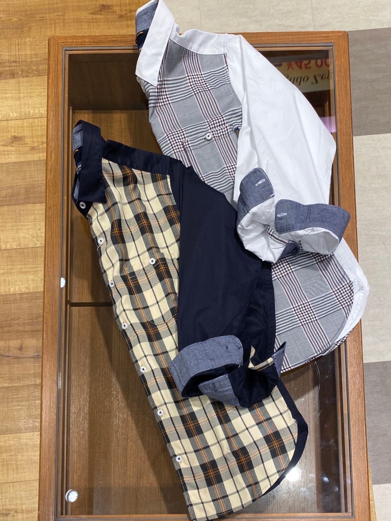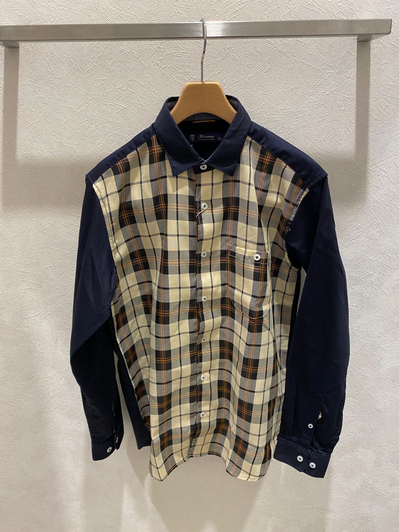 こちらのシャツは、前身頃の素材はポリエステル100%になっております。秋らしい落ち着いたデザインになってます。
