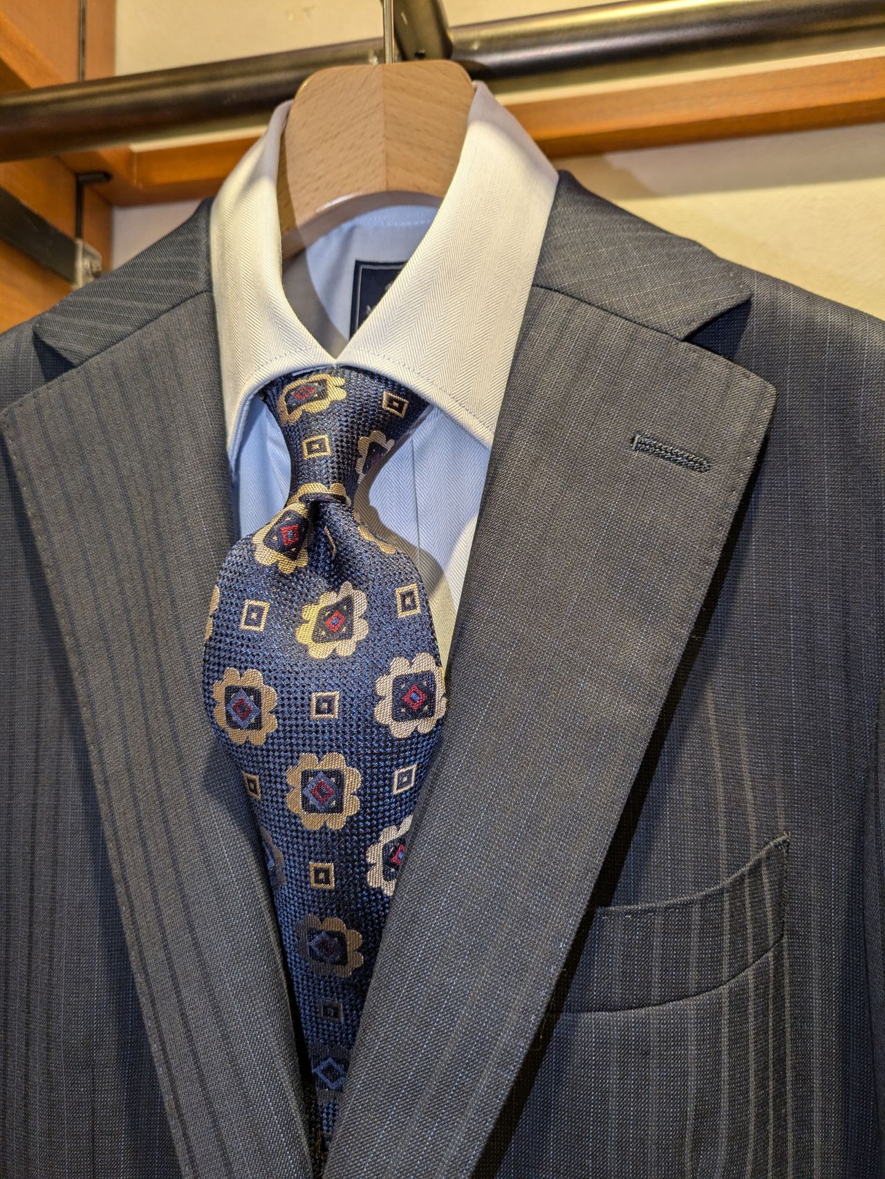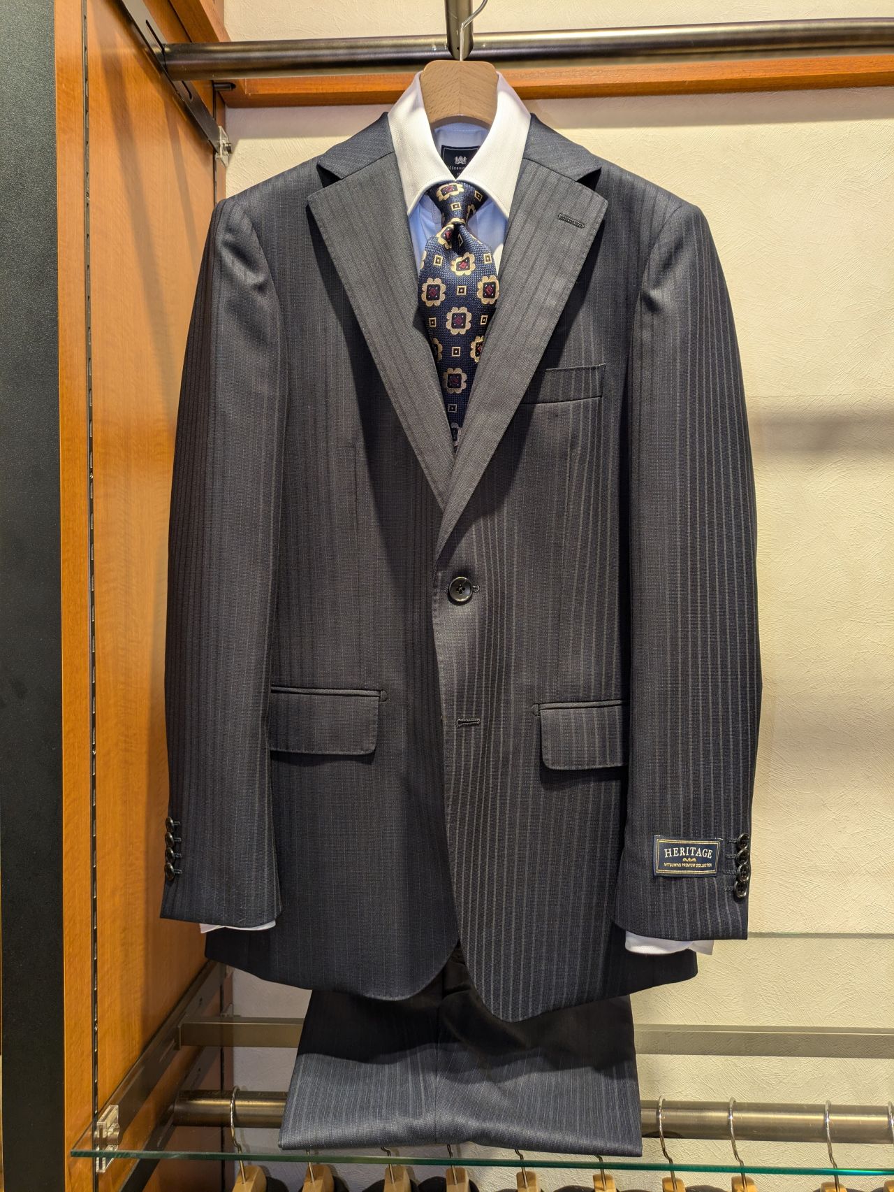 ピンベースのネイビーストライプも光沢があり、上品な印象です。