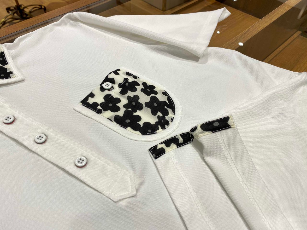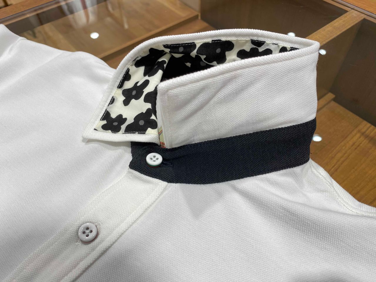 襟部分にはフラワープリント、襟を立てれば台襟部分はブラックの切り替え生地になっているので襟を立てても着用いただけます。