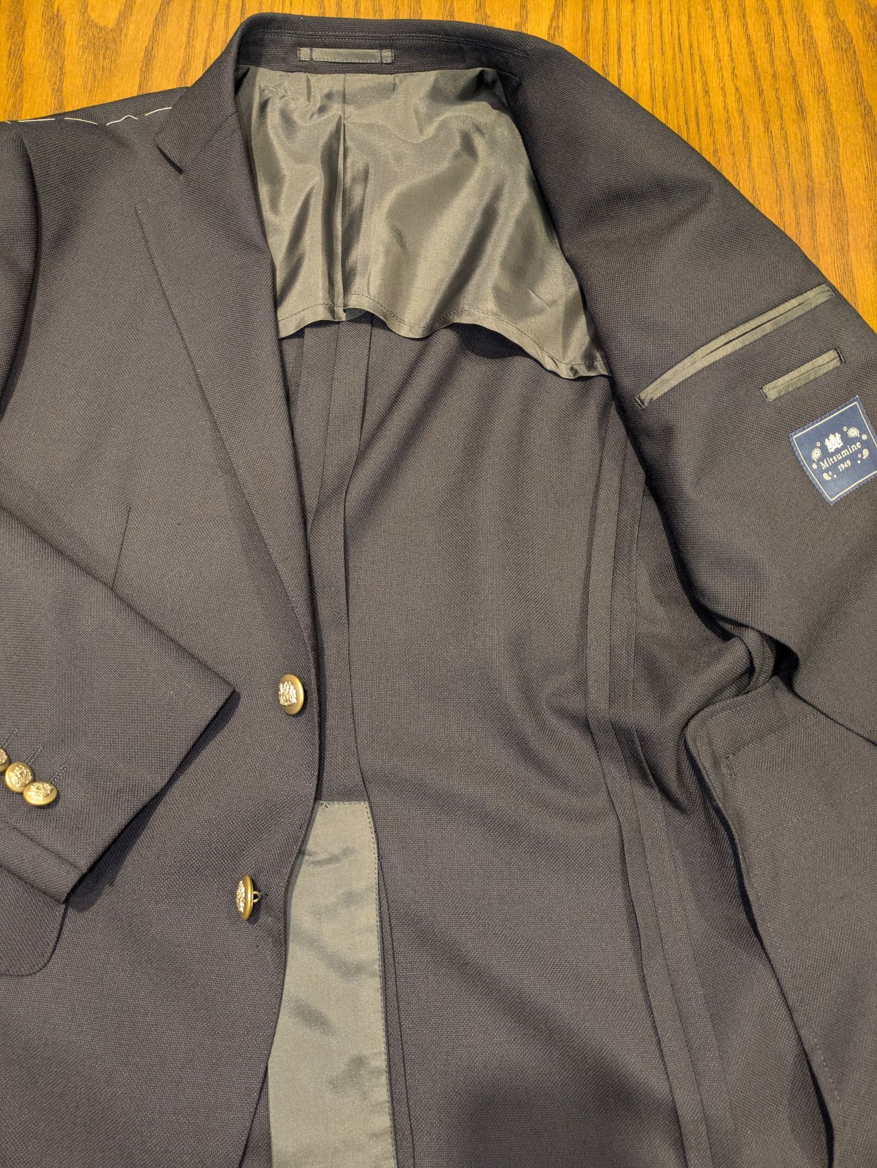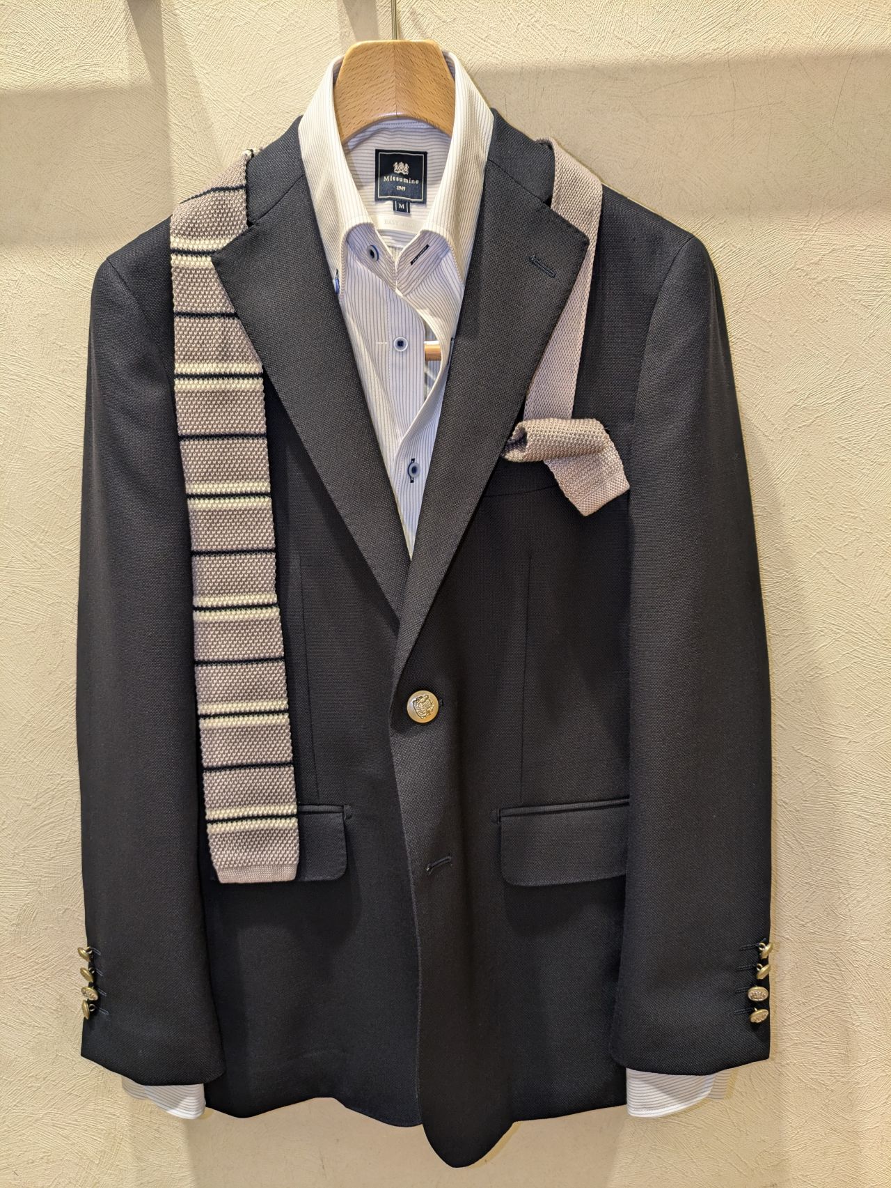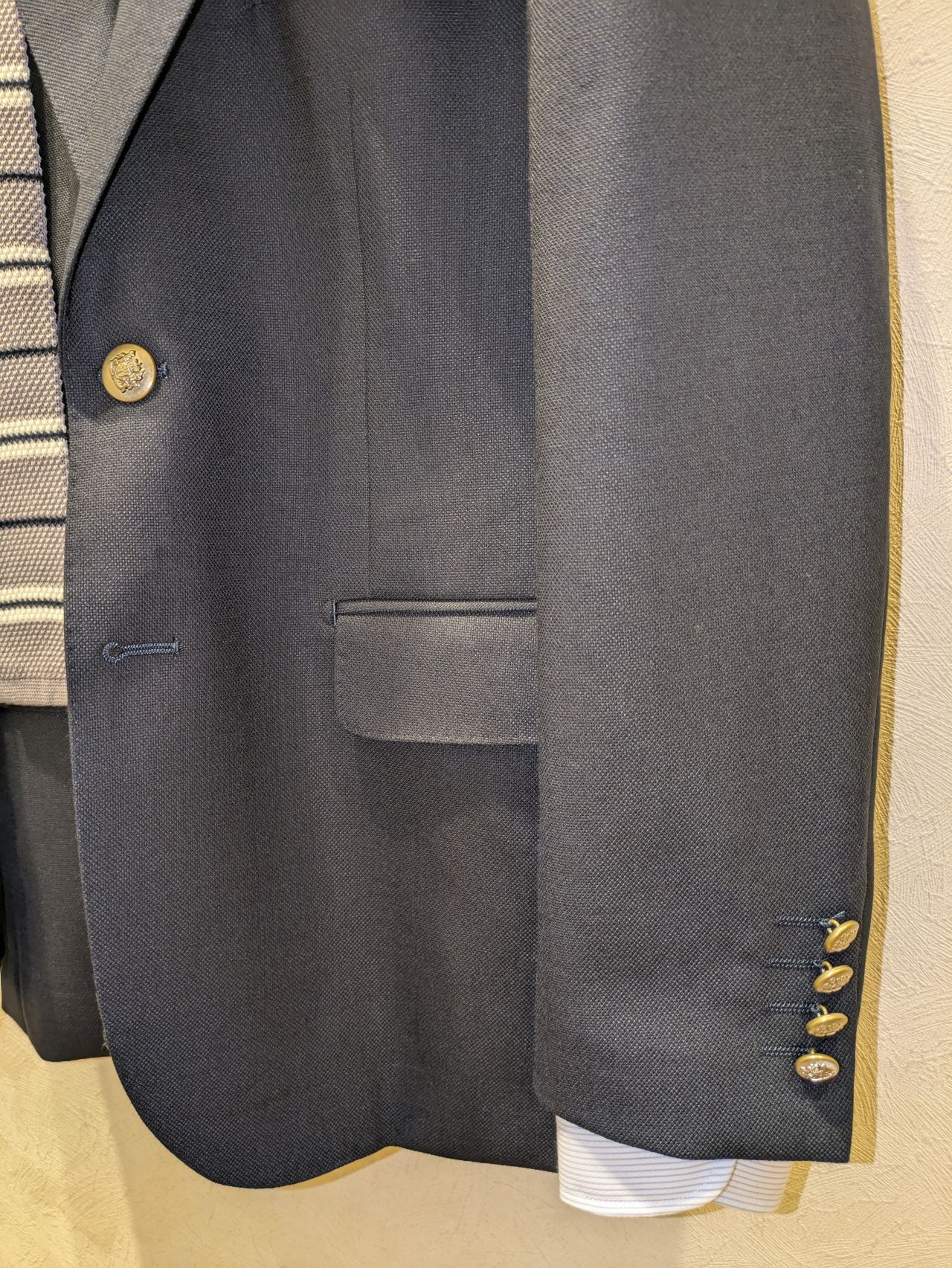ウール×ポリエステルの生地を使用した夏のブレザーは、軽量でシワもつきにくい作りになっております。