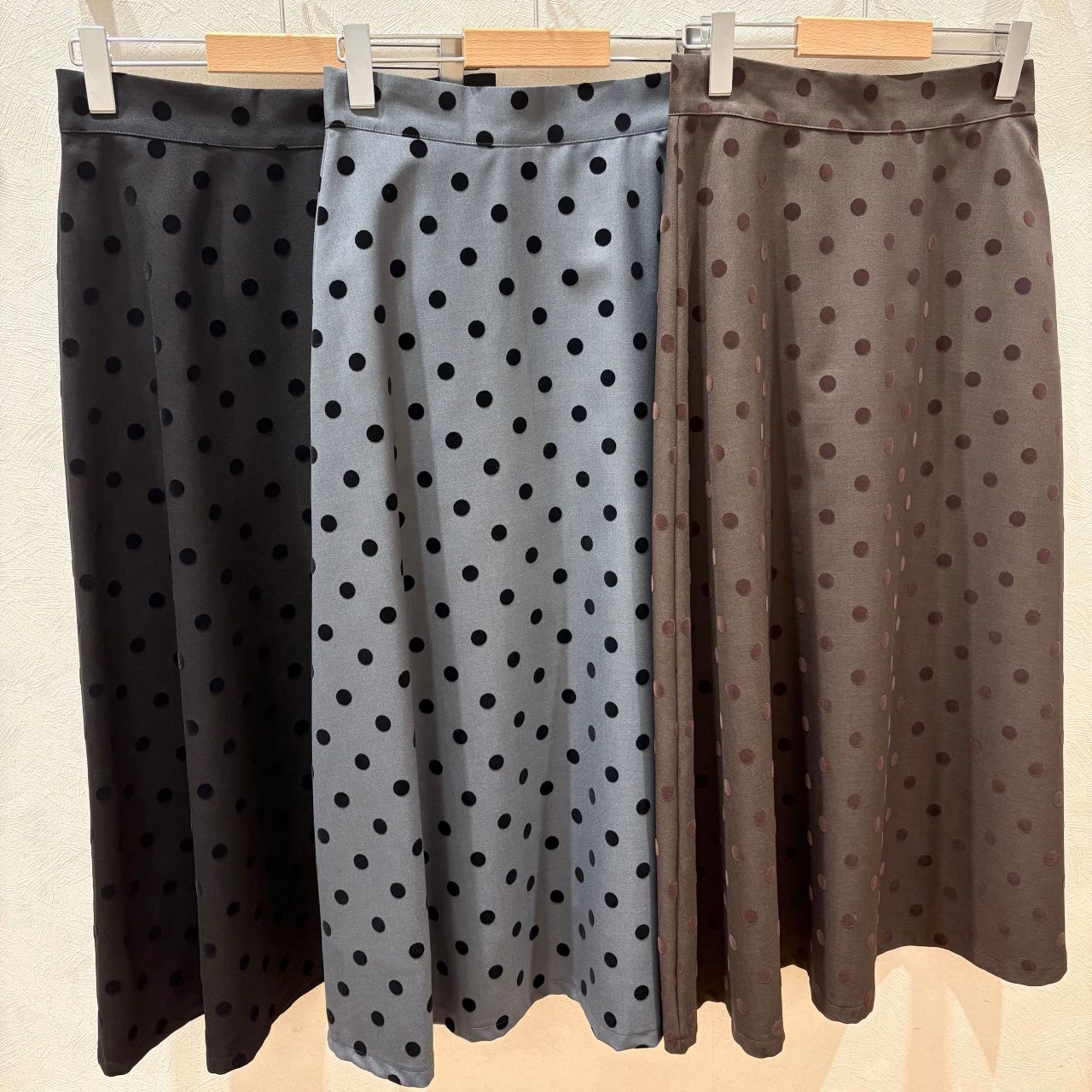 落ち着いた雰囲気の中に、可愛いらしさがプラスされたドット柄が特徴のスカート♪