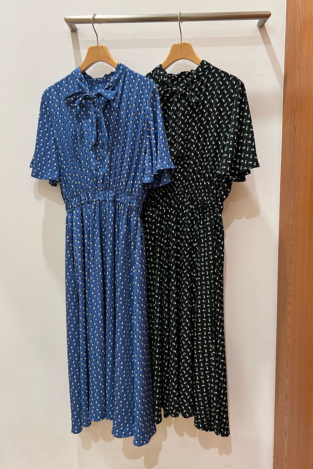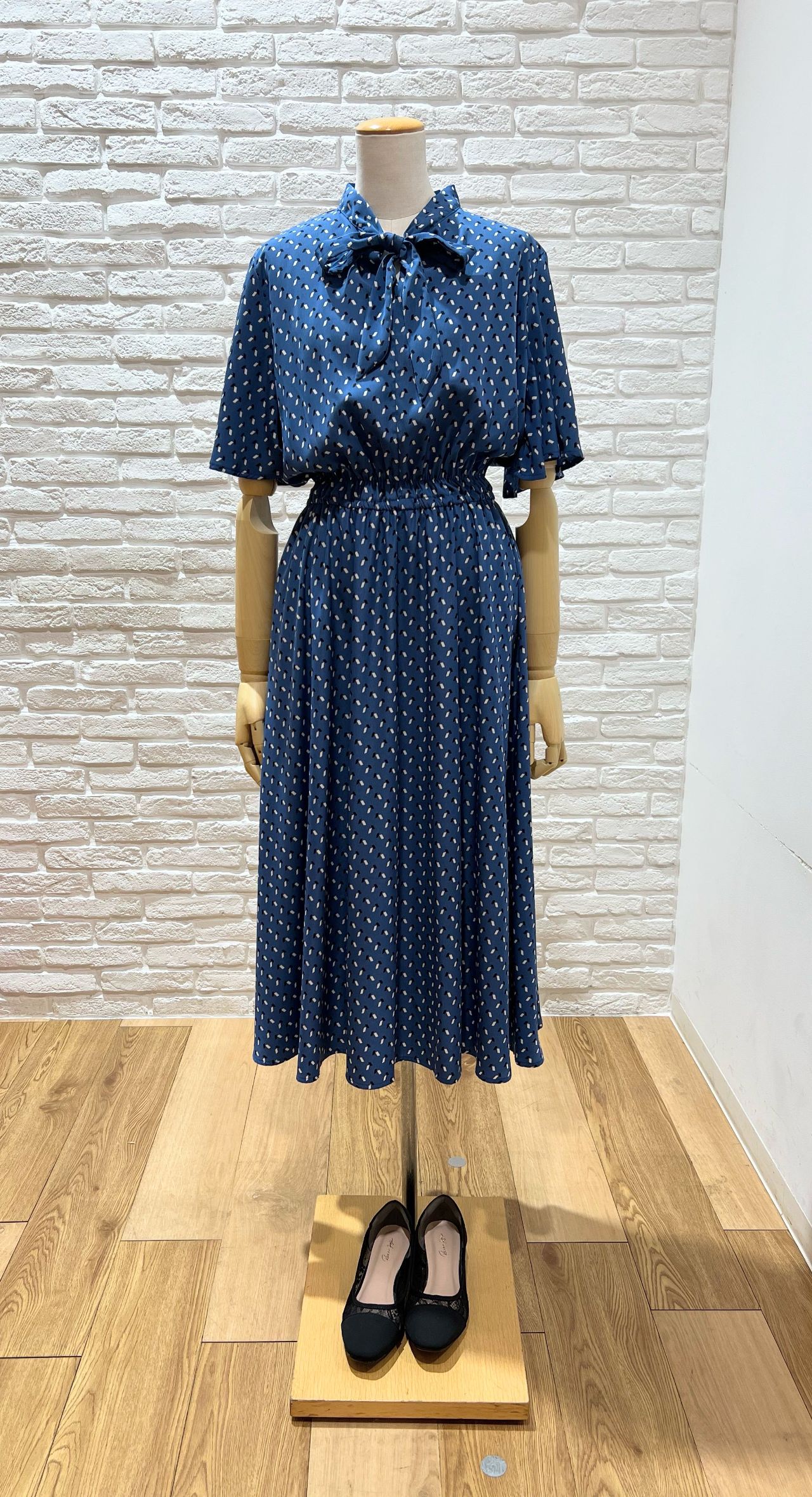 幾何柄ボータイ半袖ワンピース