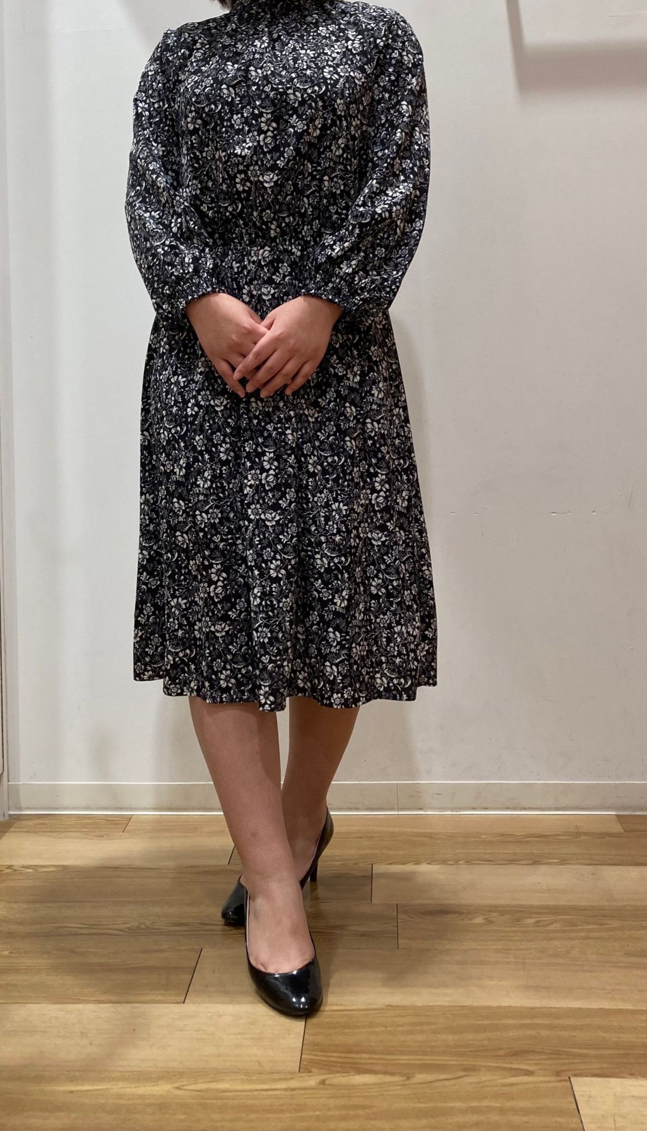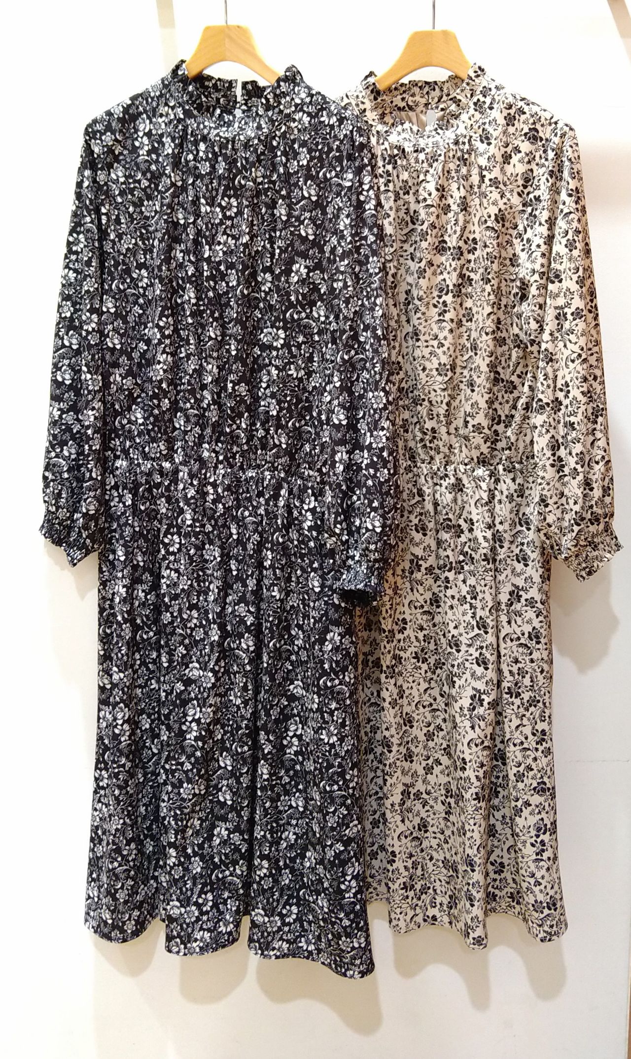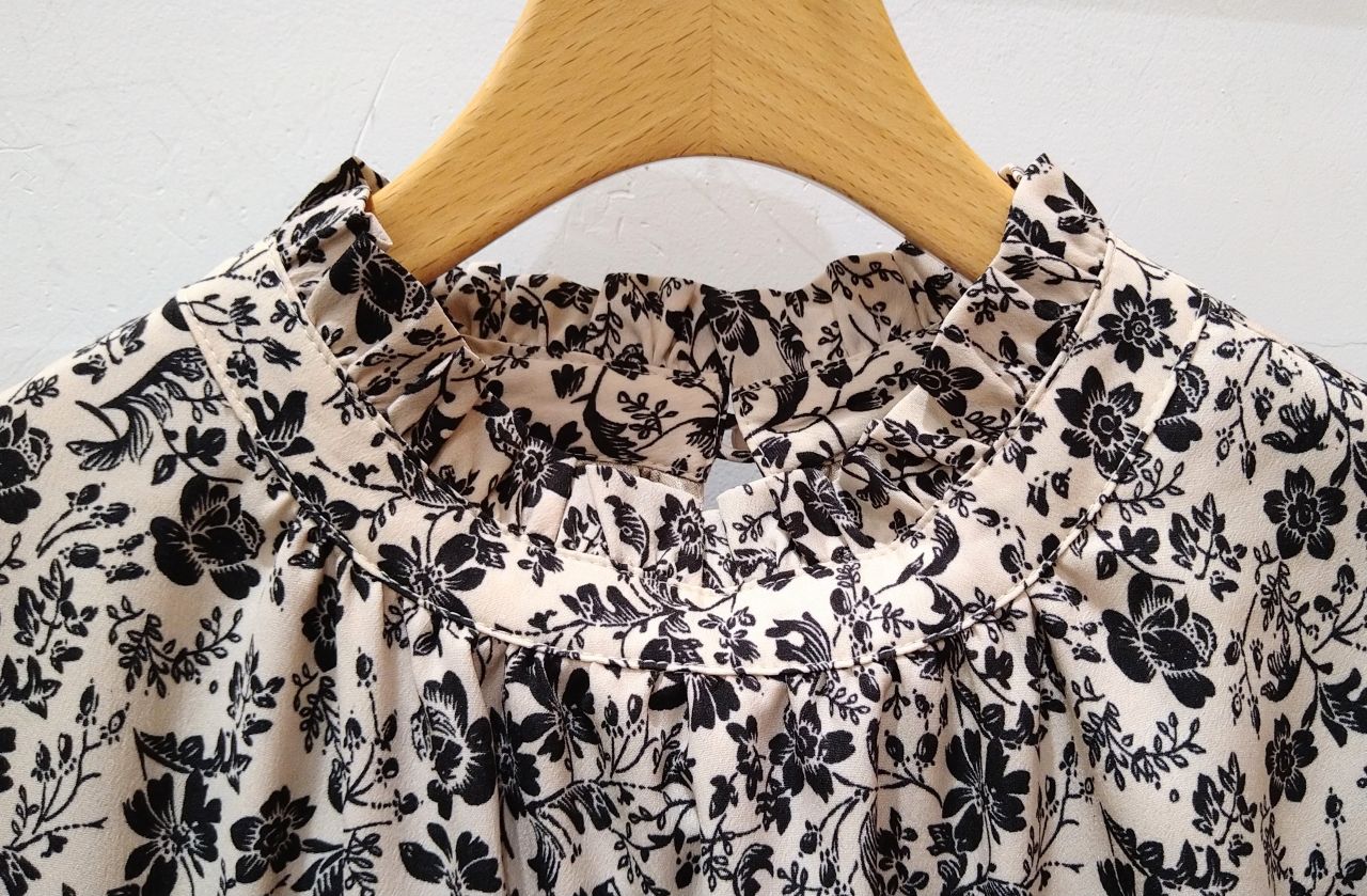 首元のギャザーハイネックが大人っぽい、花柄のワンピースです!