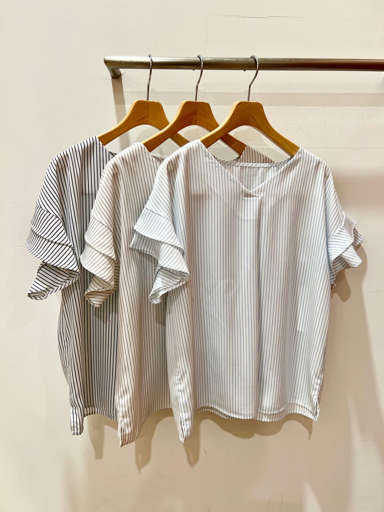 すっきりとしたVネックで、ストライプがよく映えるブラウスです!