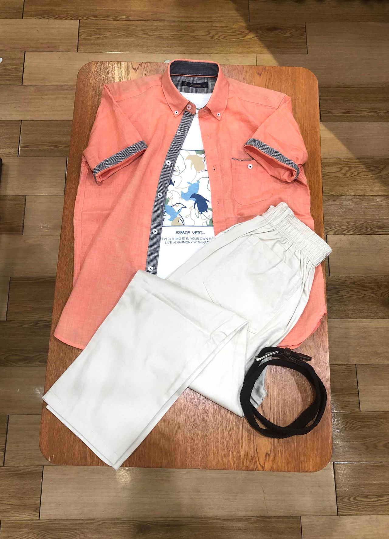 オレンジ系シャツの色にベージュ系統の