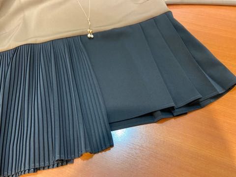 また、切り替え部分はバイカラーで左右で異なるプリーツが入っており、