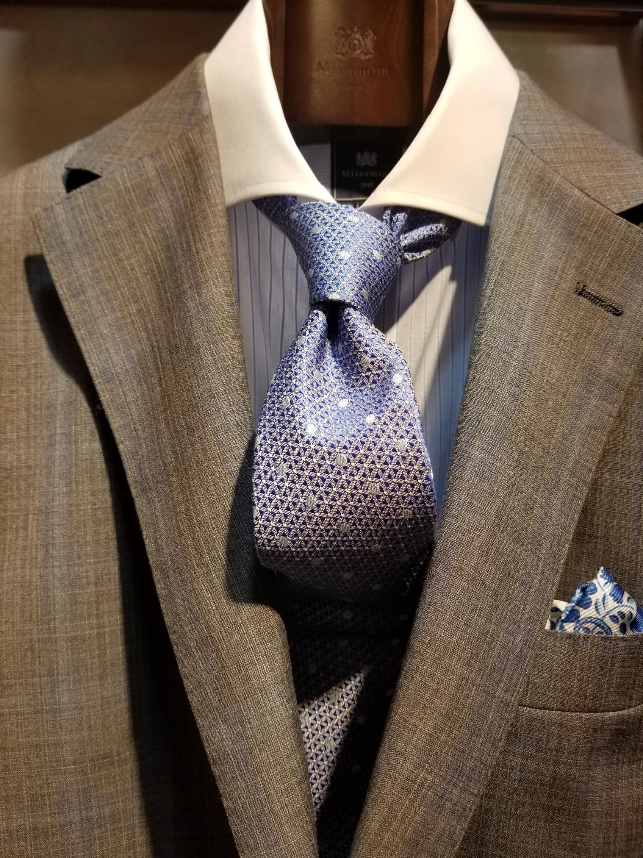 シャツの色と同系色のネクタイを使うと落ち着いた印象になります。