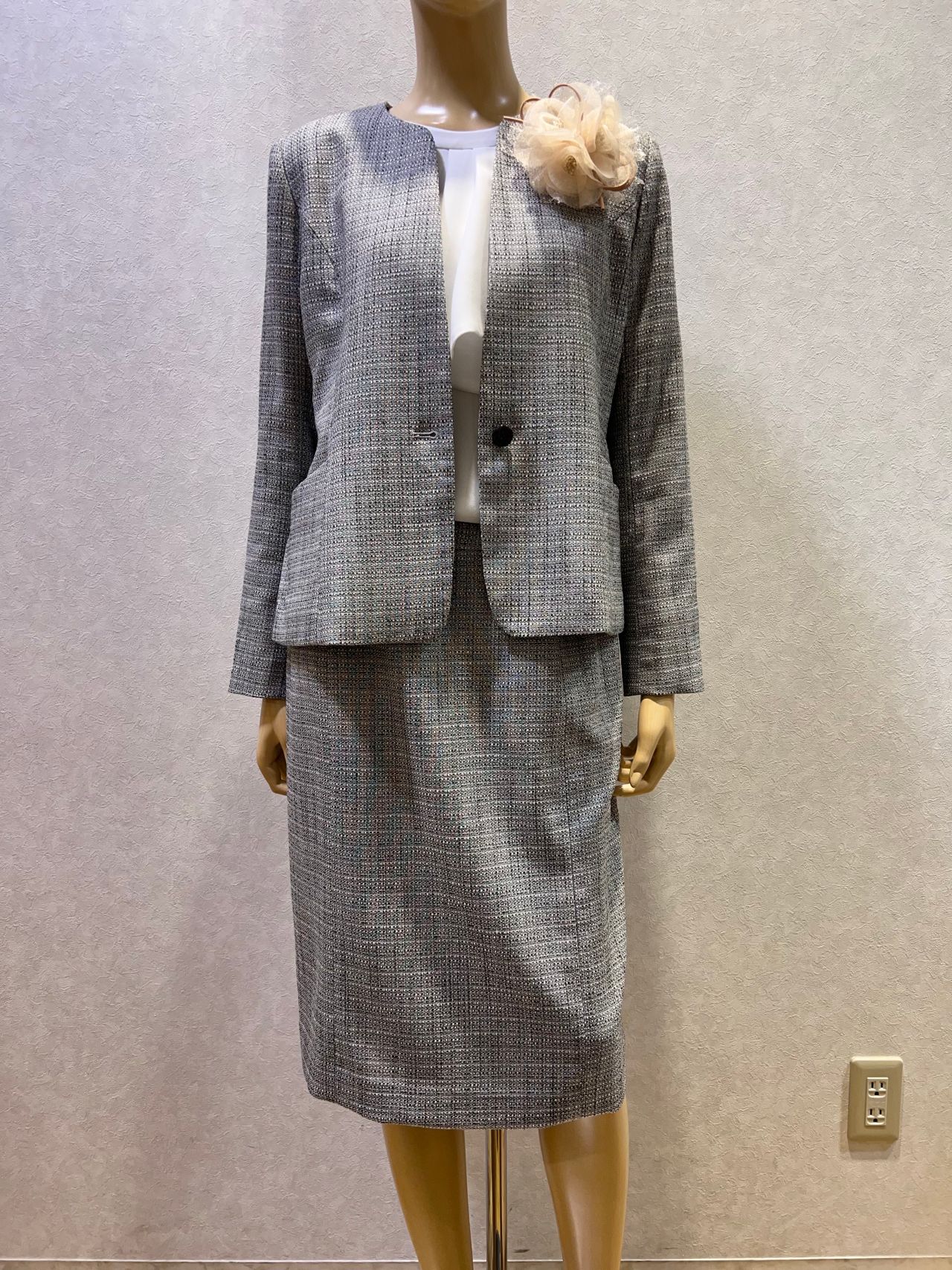 定番のツイード柄のセットアップ。