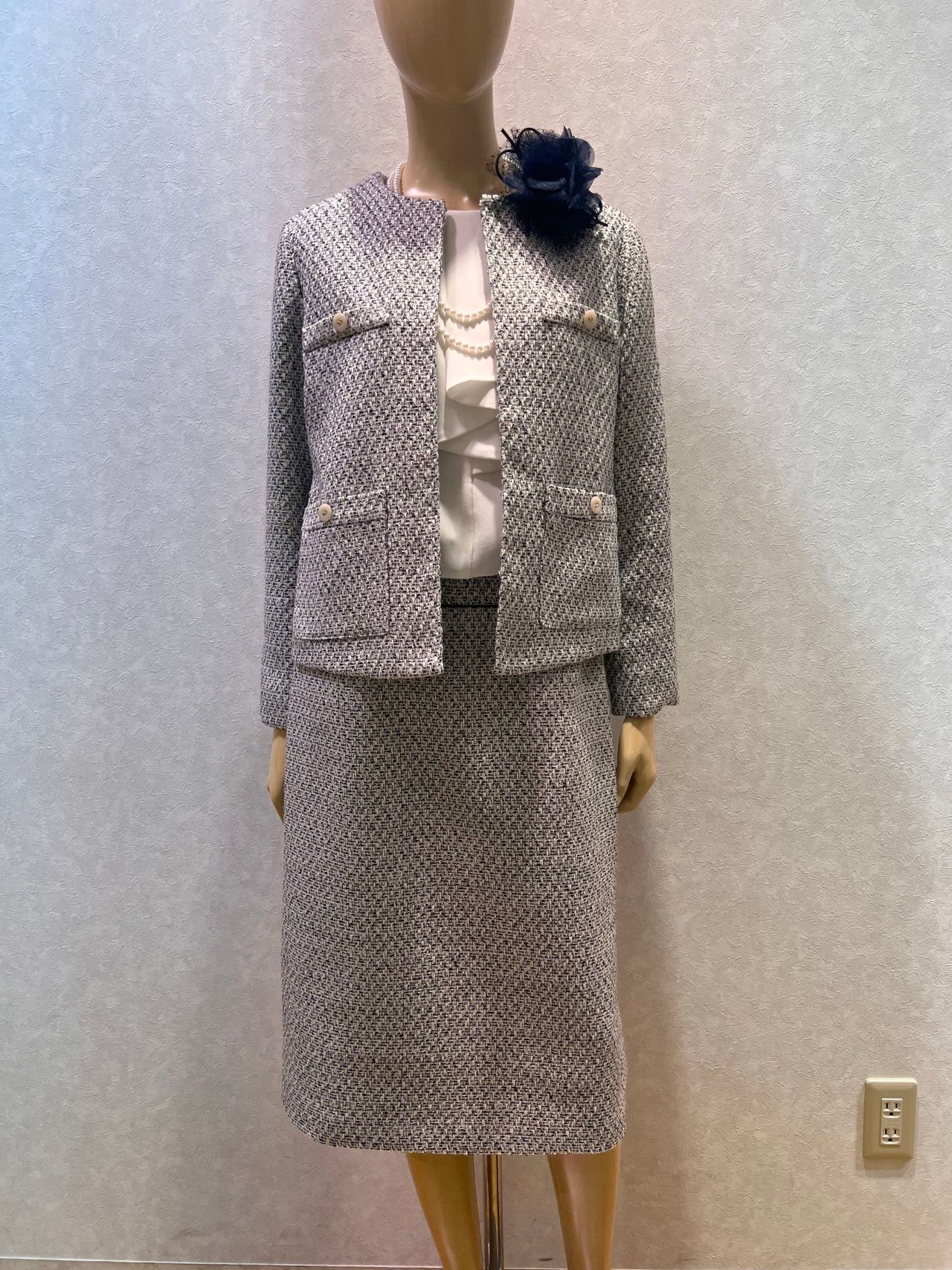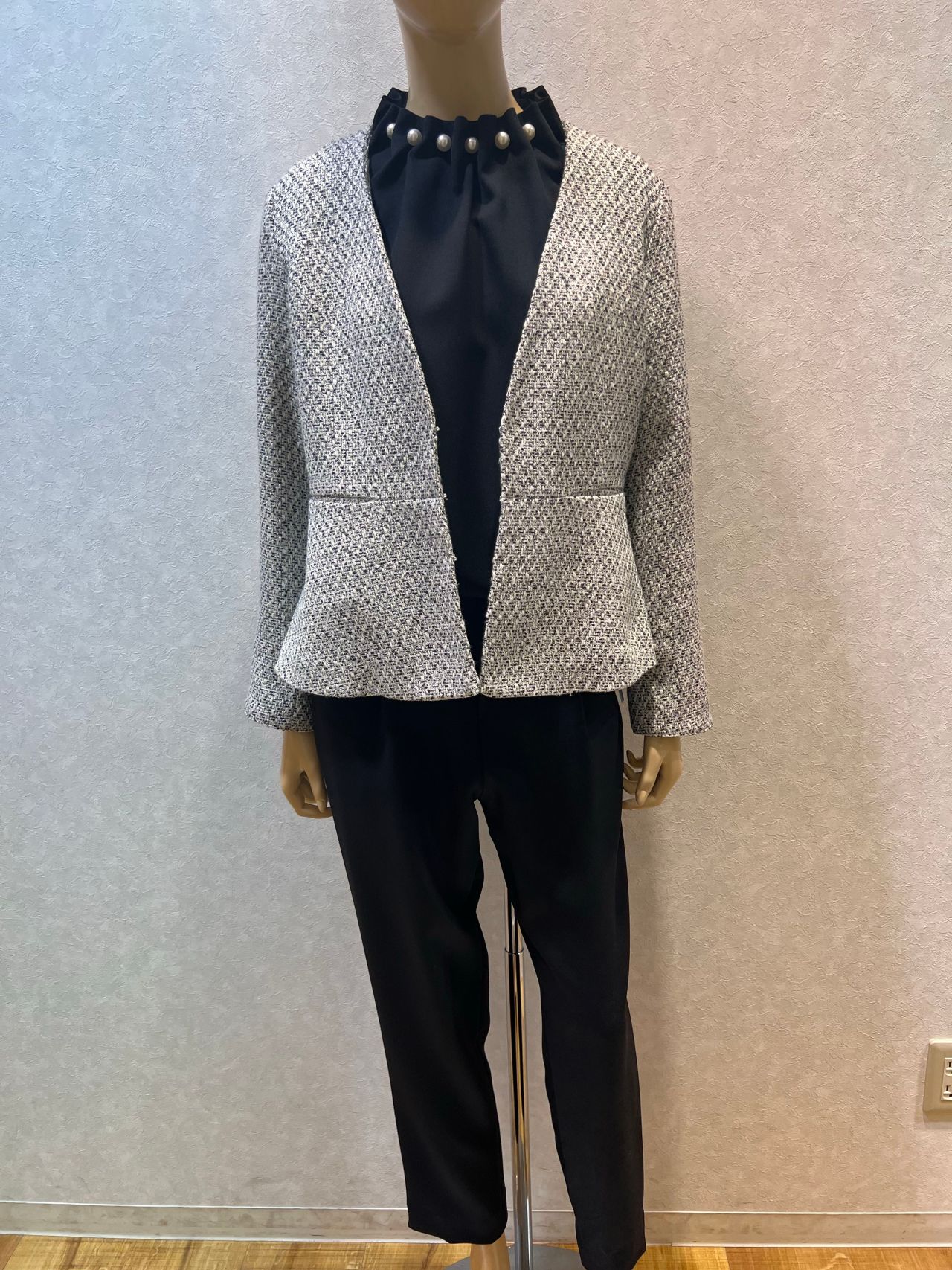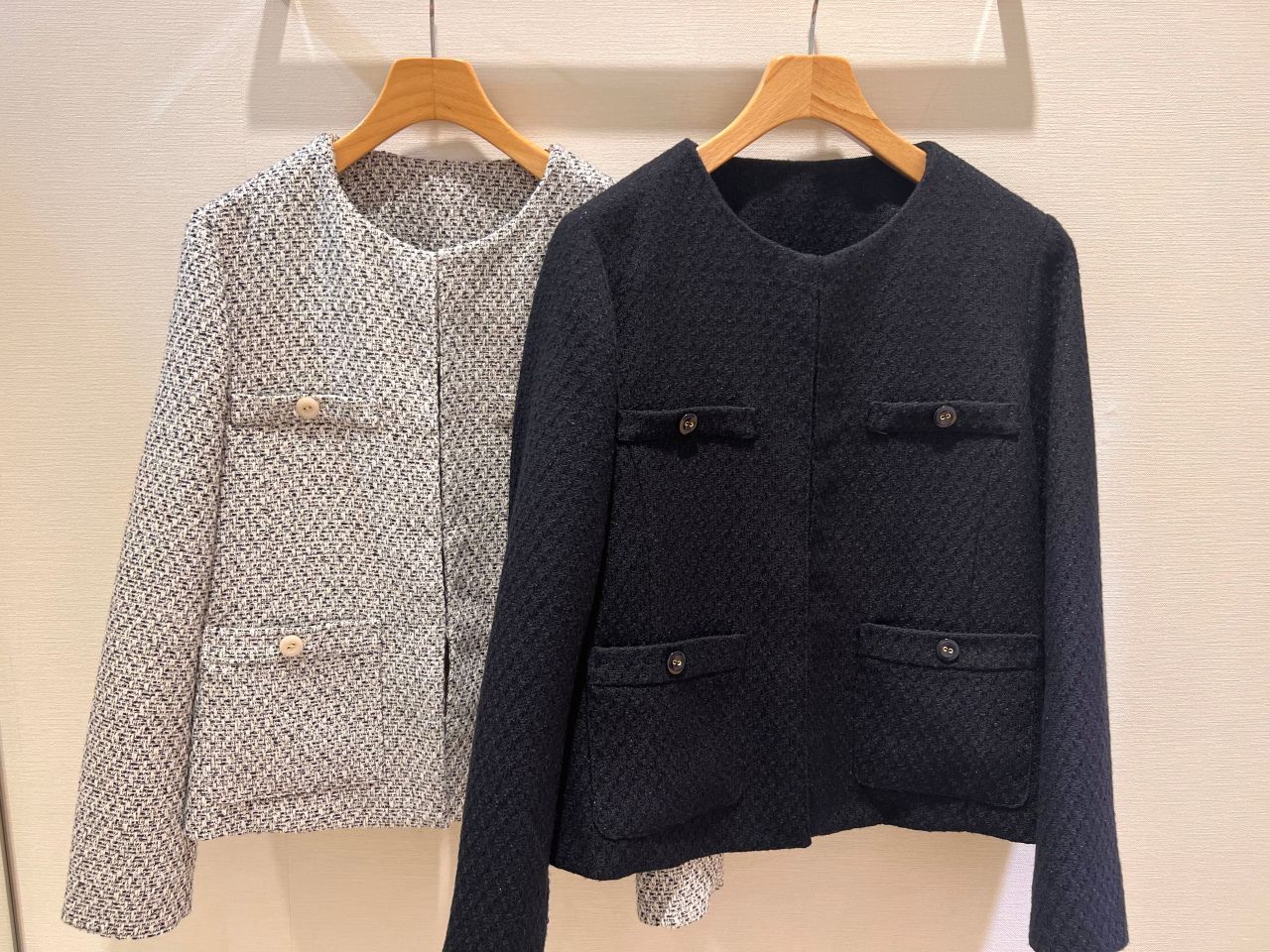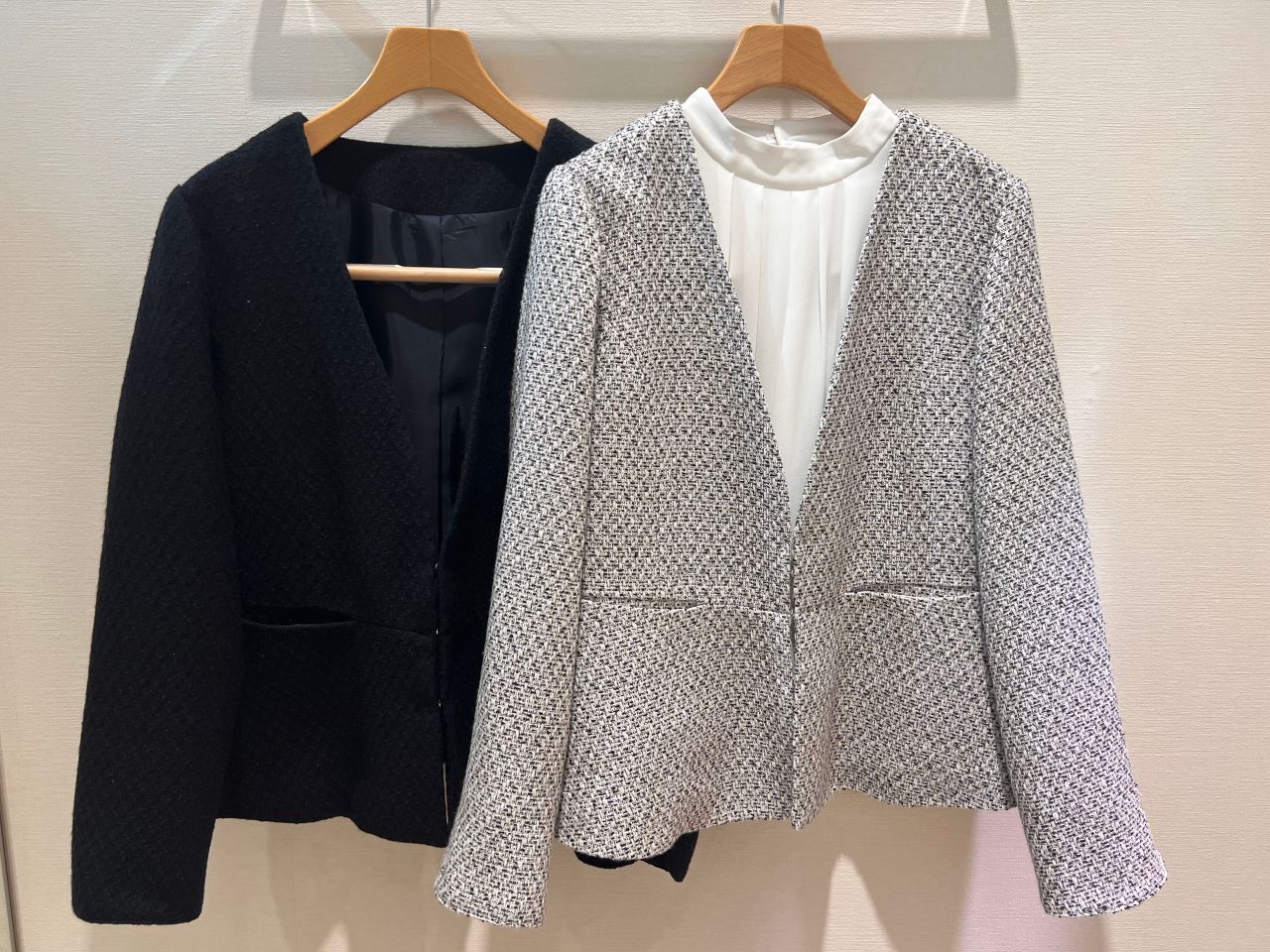 ジャケットは首元がスッキリ見えるカラーレスタイプと少しフェミニンな印象のノーカラータイプの2種類ご用意しております。