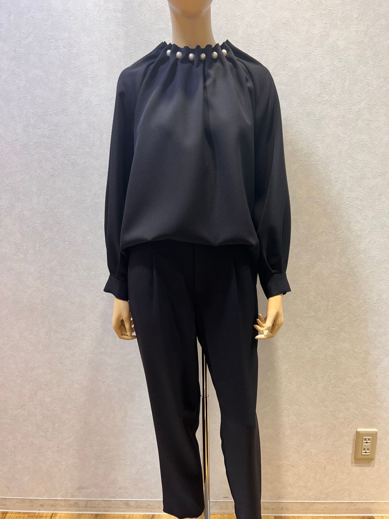 ソフトツイル パール付きネックブラウス