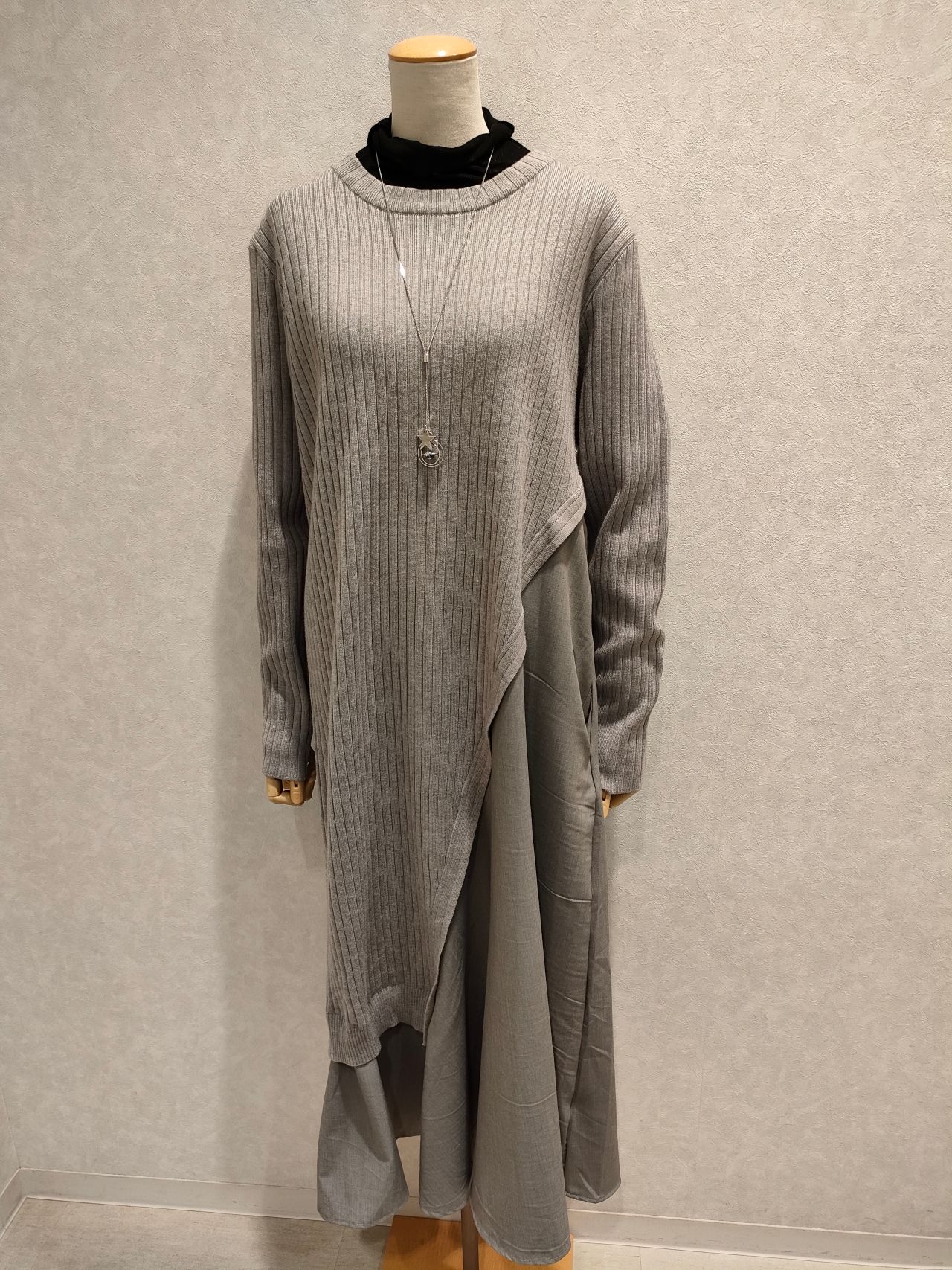 ニットワンピースの中に薄手のインナーをきて、シーズンを長く着ることも可能ですよ。