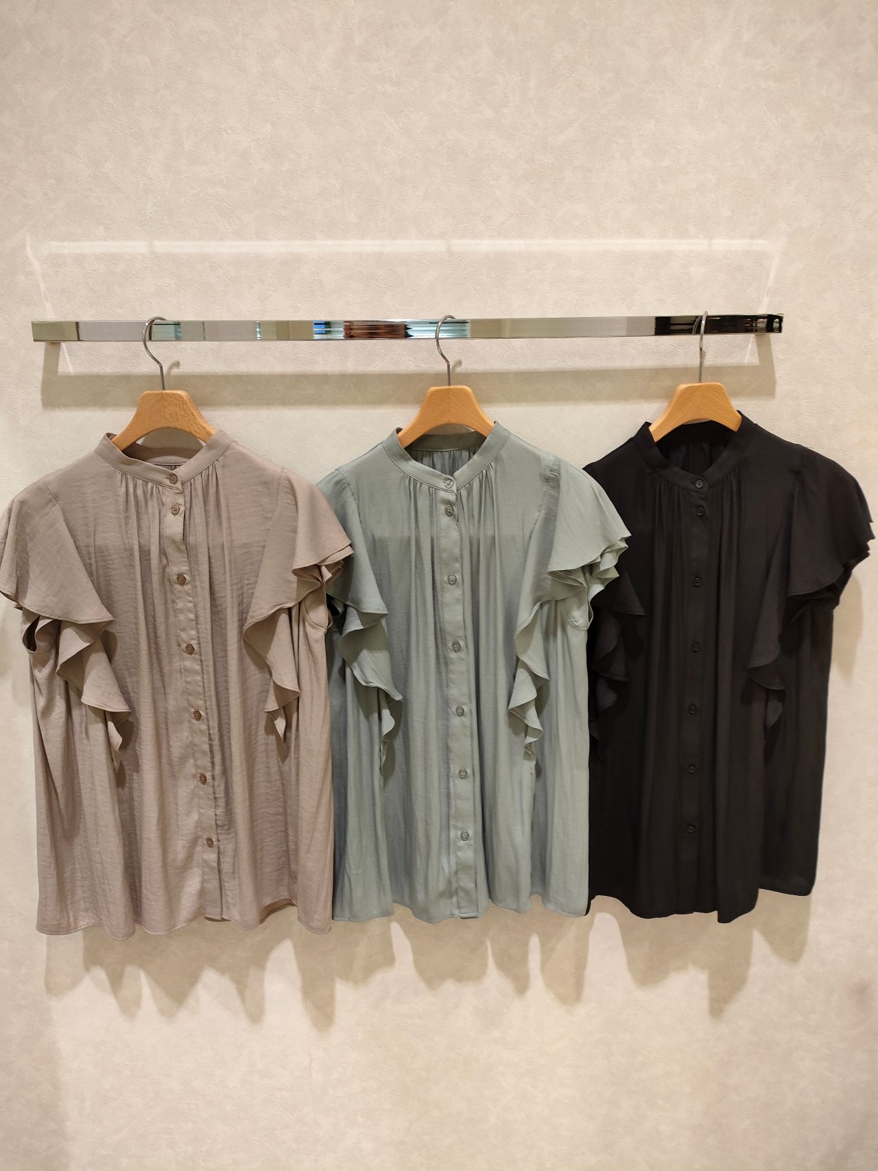 袖フリルが特徴的なブラウスです。前開きなので、脱ぎ着がしやすいです。