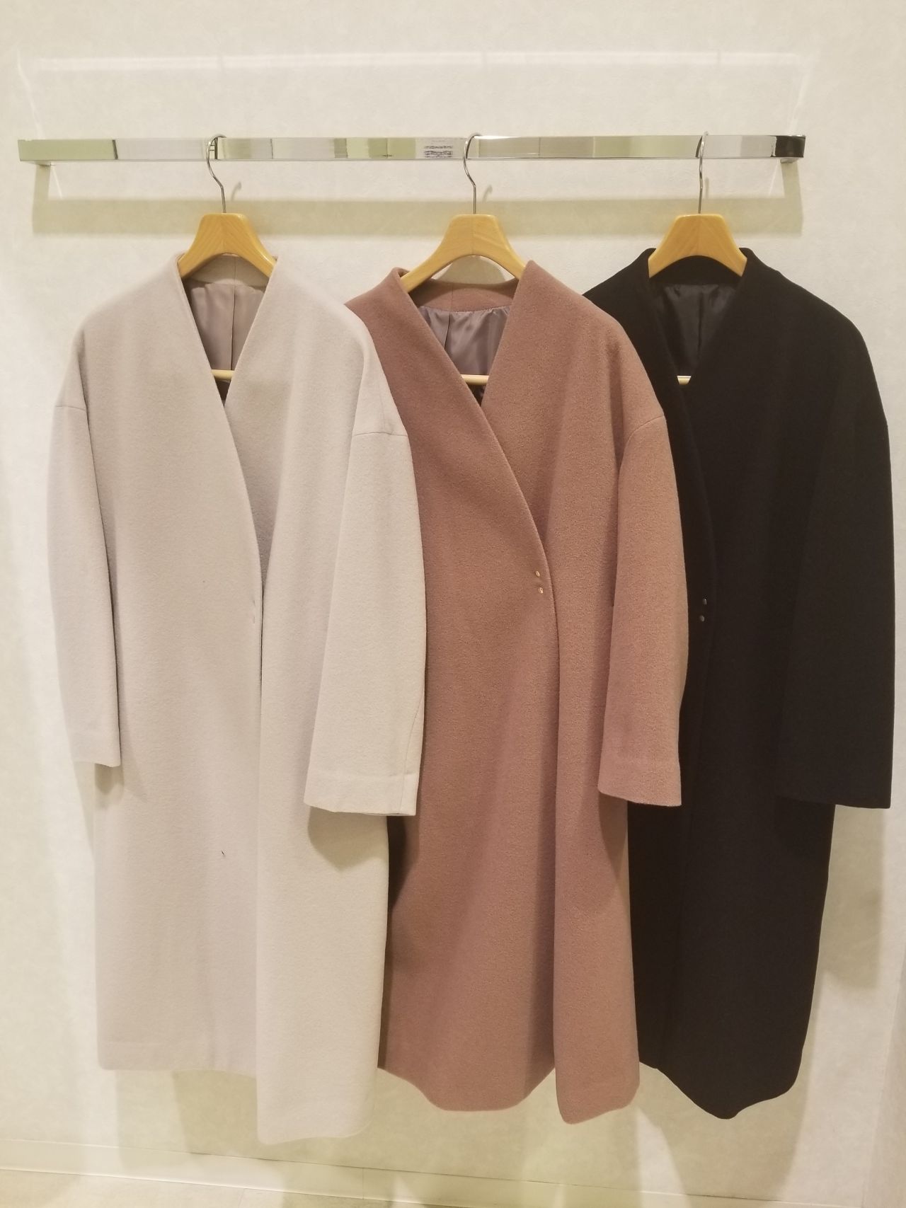 これからニット等、厚めのインナーを着る時に最適なコートです!お色は、3色ご用意しました。