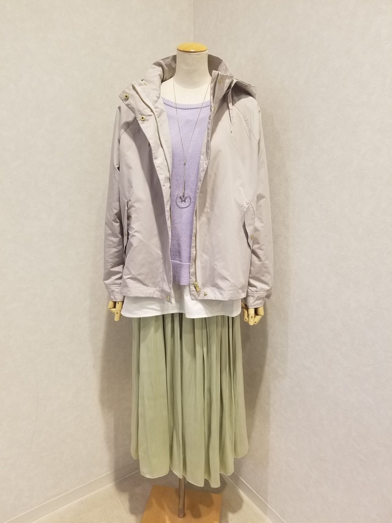春なので、パステルカラーで色味を出しても良いですね。通勤時に羽織っても良いです。