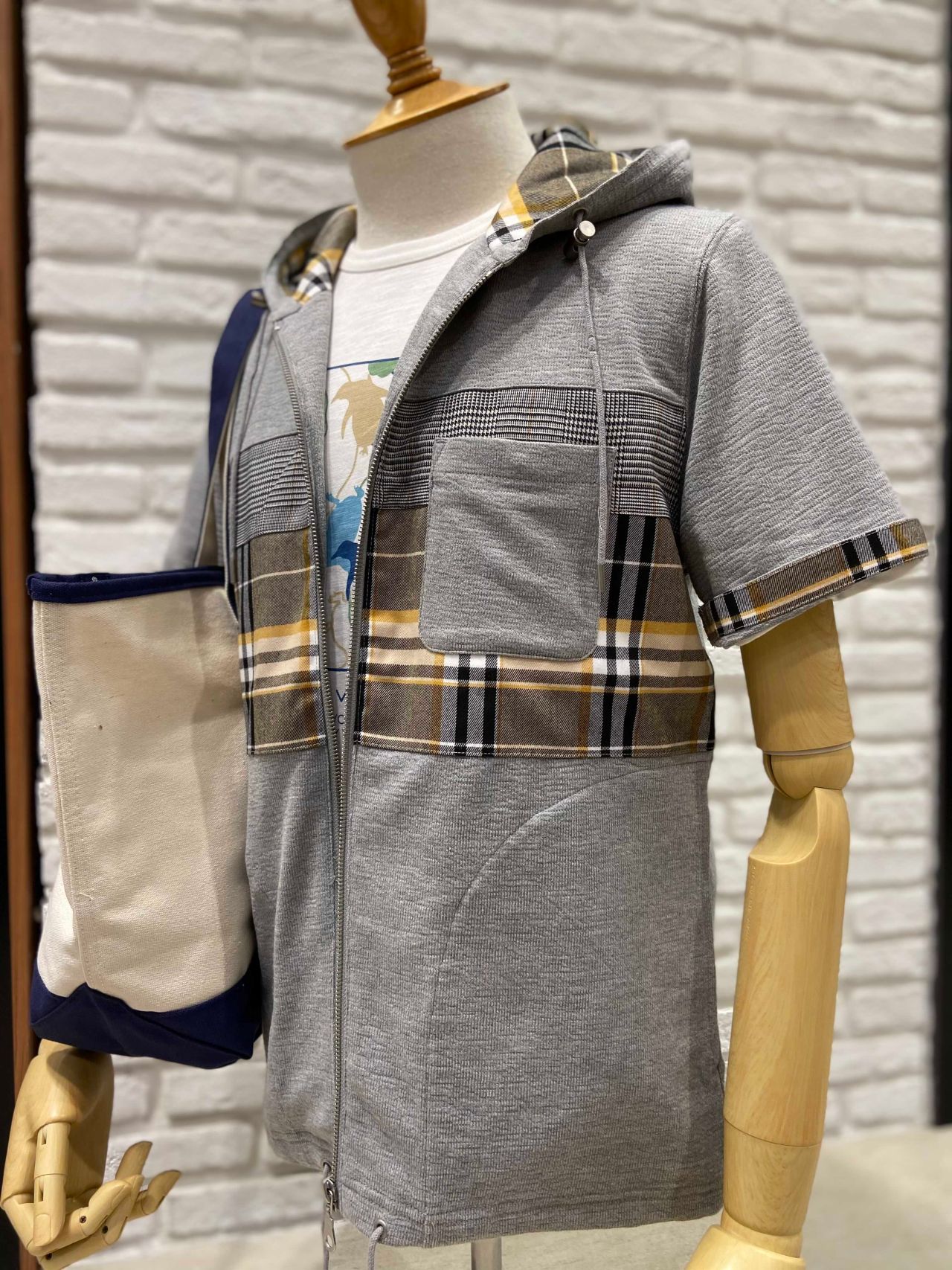 こちらのパーカーは、フロント部分をチェック柄で切り替えており、