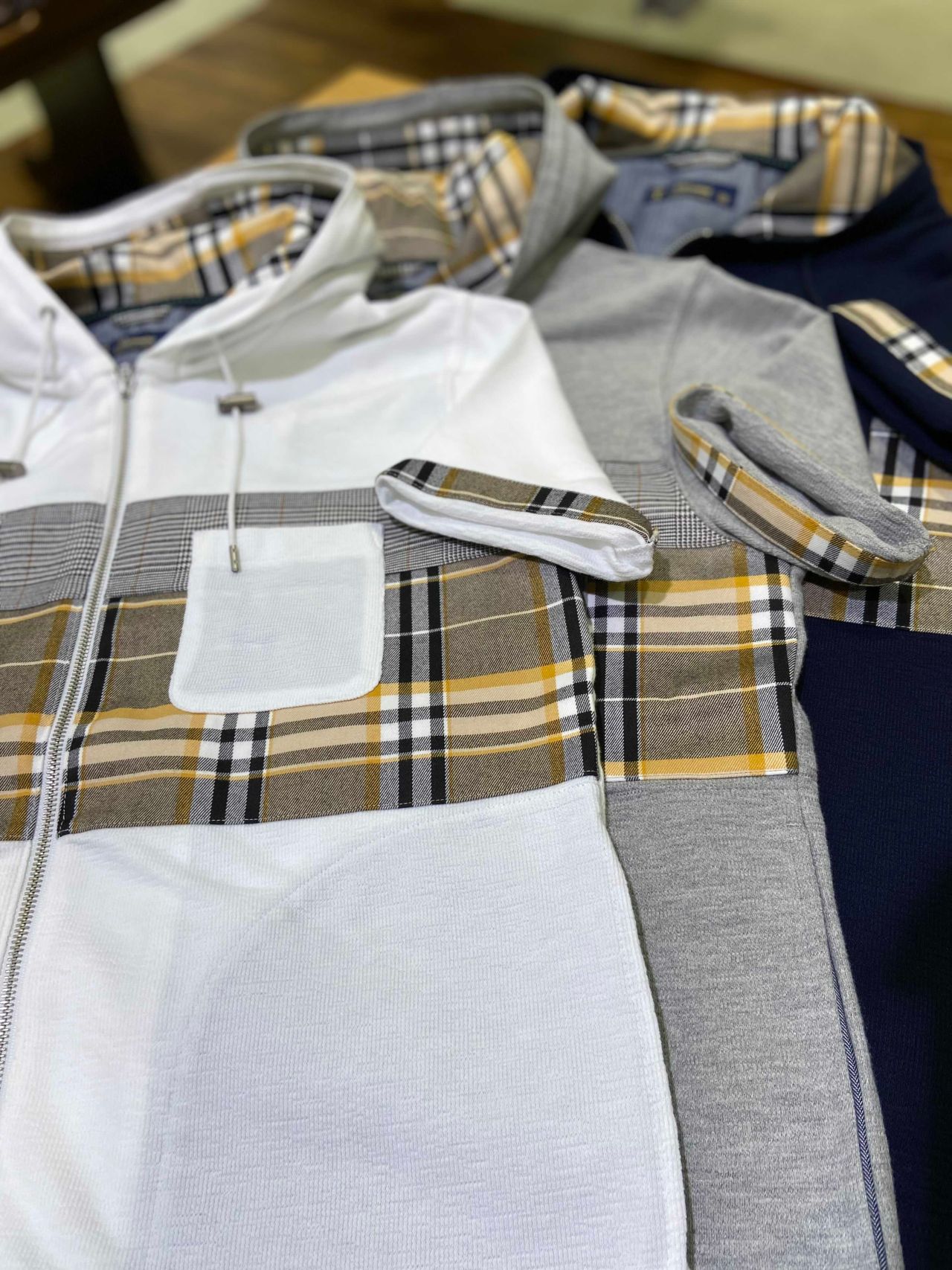 今回、ご紹介致しますお品は切り替え生地のジップアップパーカーです。