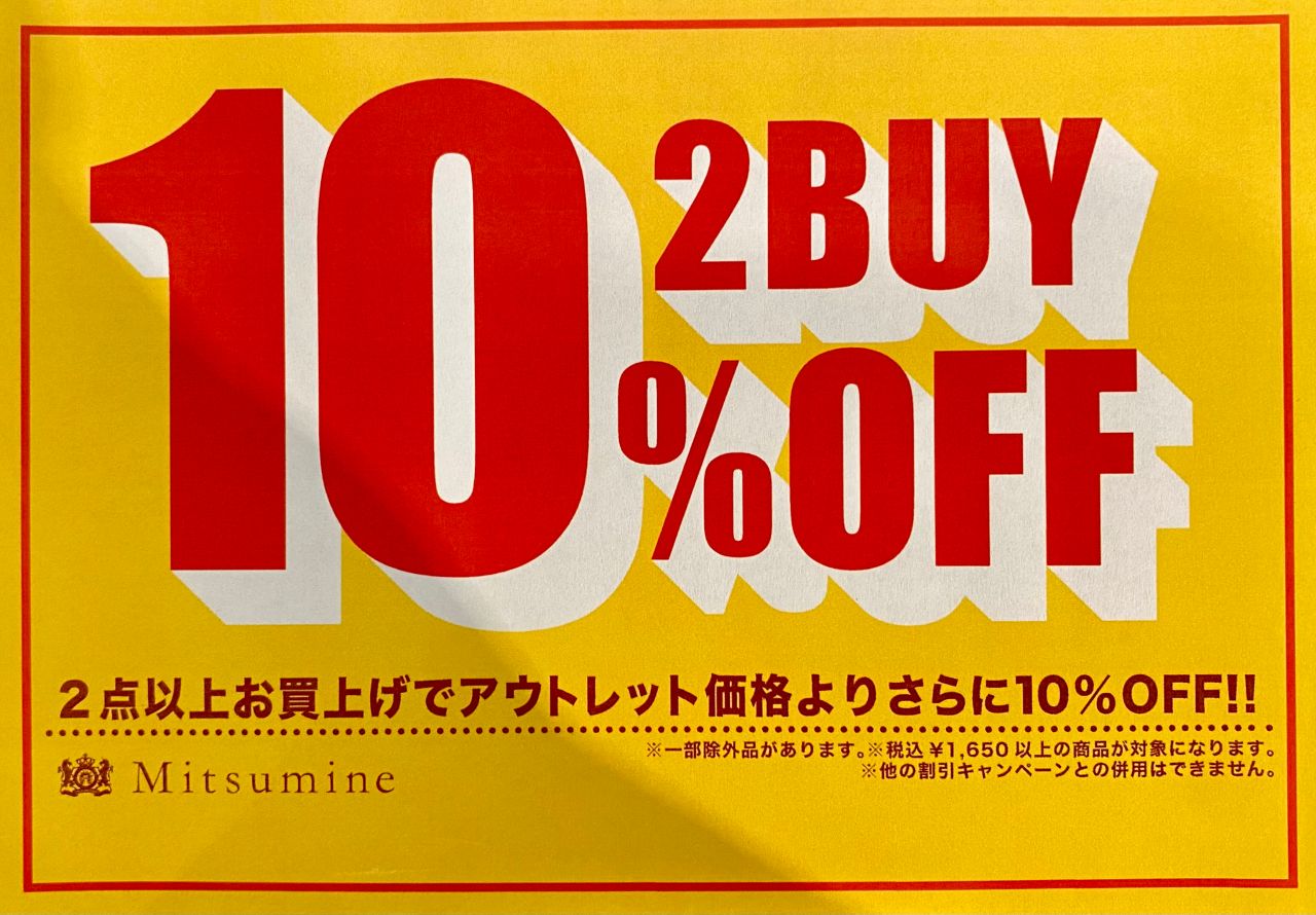 また、酒々井プレミアムアウトレットでは9/15(金)よりSeptember Specialを開催中!こちらに合わせてMitsumineアウトレット酒々井店では2BUY10%OFFのセールを実施中です!