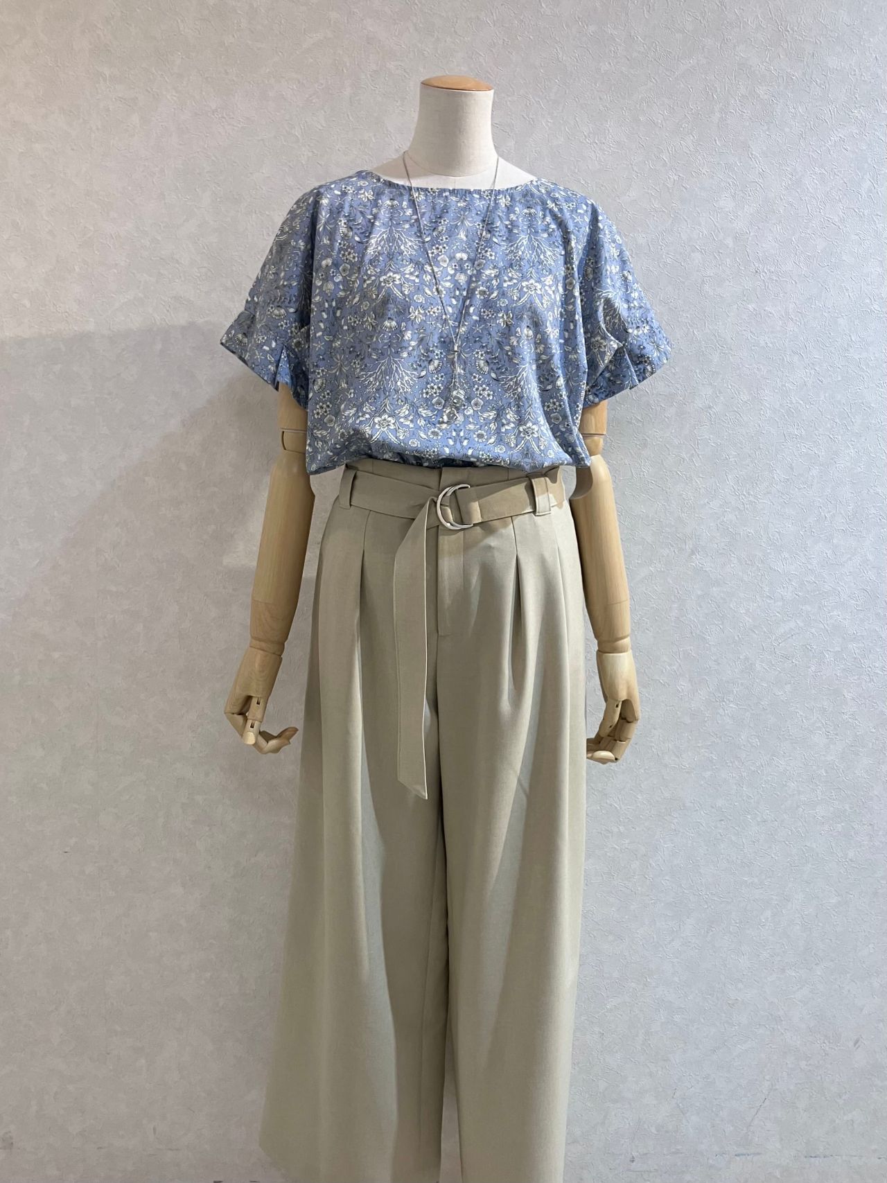 水色のブラウスはベージュのワイドパンツに