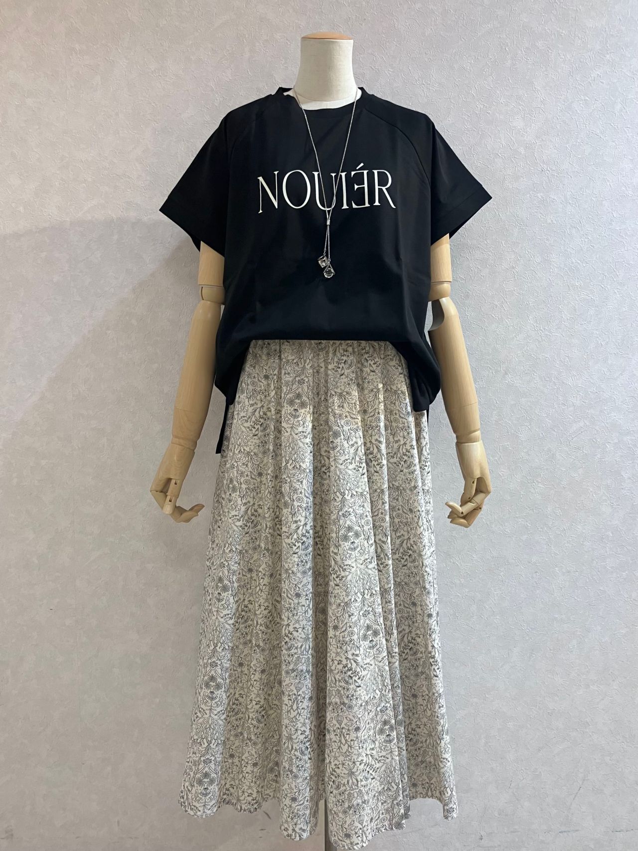 白色のスカートはロゴTシャツに合わせて